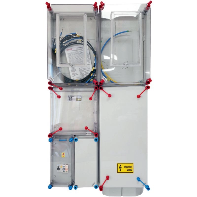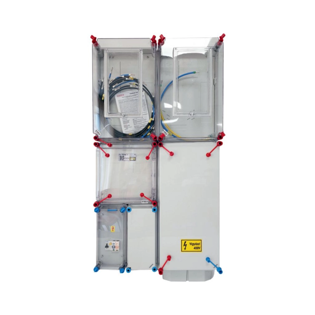 Hensel HB33KHF4D-U fogyasztásmérő szekrény, 1 vagy 3 fázisú általános és H-tarifás mérők számára, földkábeles csatlakozás, dugaljzattal 80A mindennapszaki és 63A H-tarifa