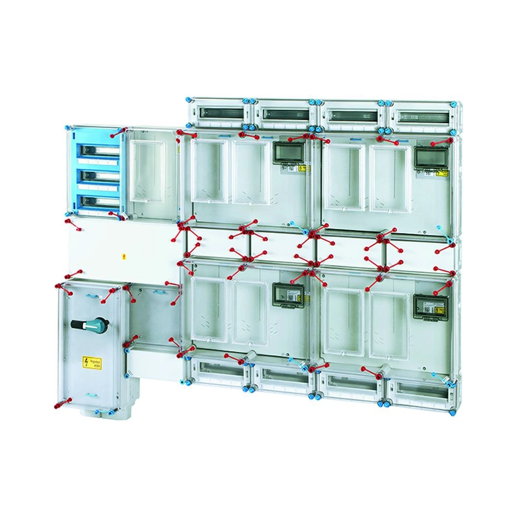 Csoportos mérőhely egyszerűsített engedlyezési eljáráshoz, 4 felhasználási helyre, 1 és 3 fázisú 2 mérőhelyes fogyasztásmérő szekrényekkel mindennapszaki (63 A-ig) és vezérelt (32 A-ig) vagy H-tarifás (63 A-ig) méréshez, földkábeles csatlakozásra, felületre szerelt kivitelben, túlfeszültség-védelmi eszköz beszerelési lehetőséggel, tűzeseti lekapcsolással, közösségi méréssel, fogyasztói főelosztóval