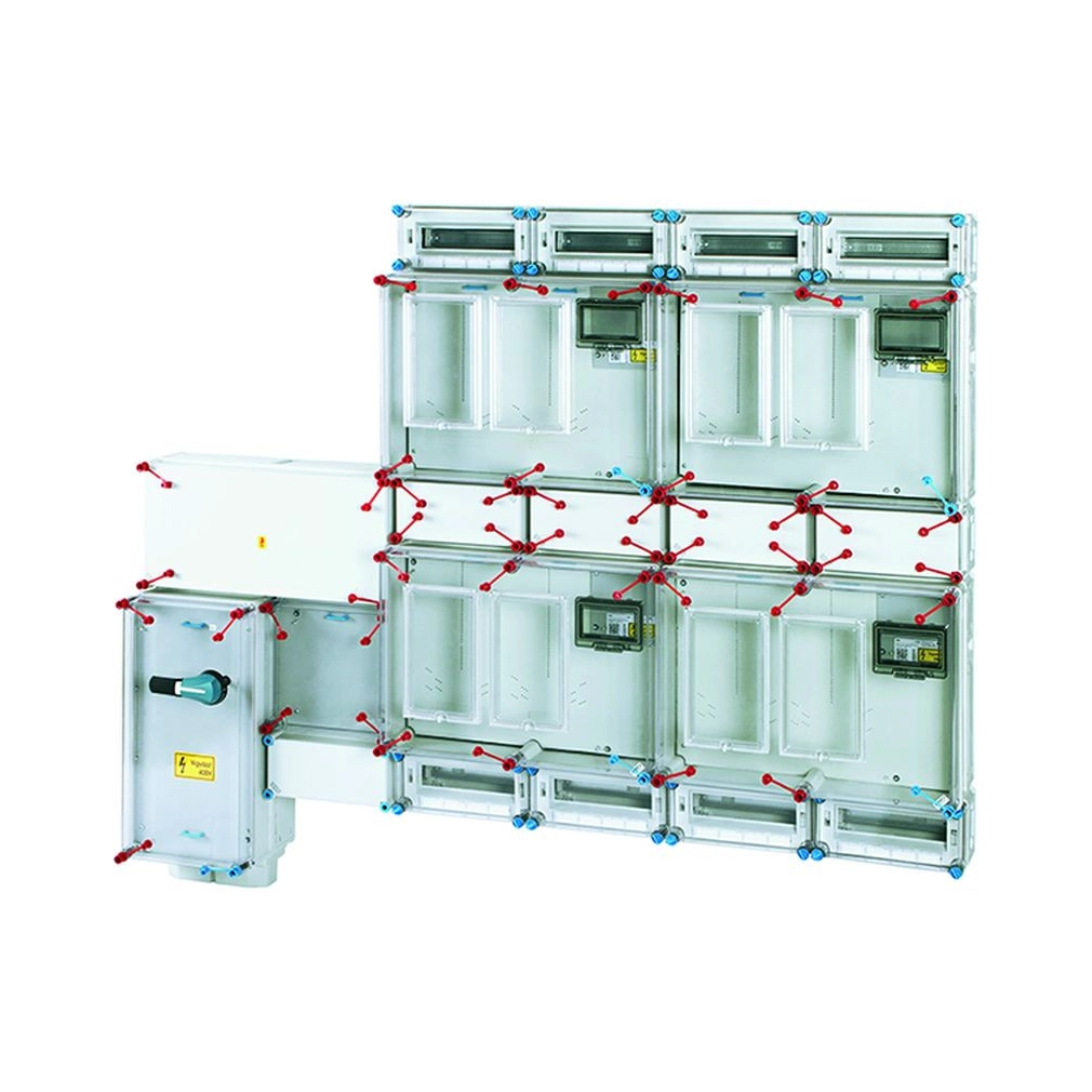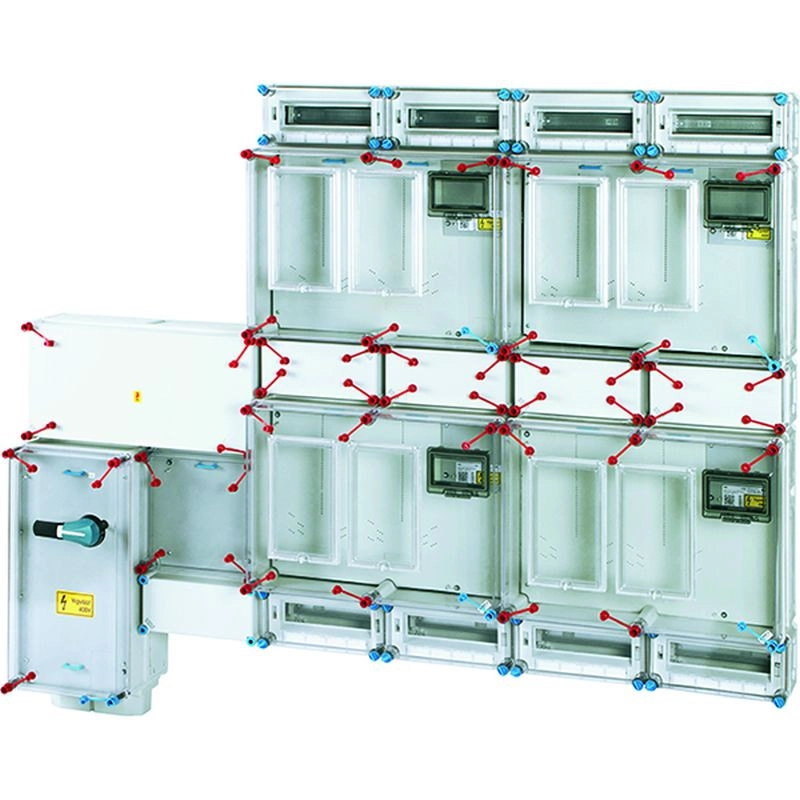 Csoportos mérőhely egyszerűsített engedlyezési eljáráshoz, 4 felhasználási helyre, 1 és 3 fázisú 2 mérőhelyes fogyasztásmérő szekrényekkel mindennapszaki (63 A-ig) és vezérelt (32 A-ig) vagy H-tarifás (63 A-ig) méréshez, földkábeles csatlakozásra, felületre szerelt kivitelben, túlfeszültség-védelmi eszköz beszerelési lehetőséggel, tűzeseti lekapcsolással, fogyasztói főelosztóval