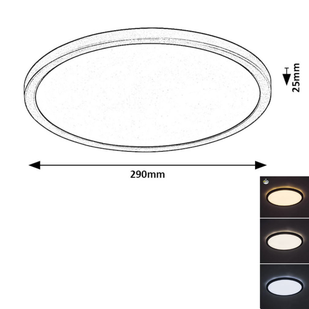 A Gonzalo Rábalux 071096 mennyezeti LED lámpa modern megoldást kínál a lakásvilágítás területén, amely kapcsolóval szabályozható fényerővel és változtatható fehér színhőmérséklettel rendelkezik. A beépített LED modul 24 wattos teljesítményt nyújt, 1600 lumen fényárammal, így energiatakarékos és hosszú élettartamú világítást biztosít, akár 25 000 órán keresztül. A lámpatest színhőmérséklete 3000, 4000 és 6000 Kelvin között állítható, lehetővé téve a hidegfehér és melegfehér fény közötti váltást. A termék IP20 védettséggel rendelkezik, fekete és fehér színben, 29 cm átmérővel és 2,5 cm magassággal készül, műanyag alapanyagból. A mennyezeti lámpa 230 V névleges feszültséggel működik, energiaosztálya G. A csomagolás méretei: 32x32x4 cm, a termék tömege 0,487 kg. A Rábalux által gyártott LED lámpa alkalmas minden helyiség általános megvilágítására, ahol fontos a fényerő és a színhőmérséklet egyszerű szabályozhatósága.