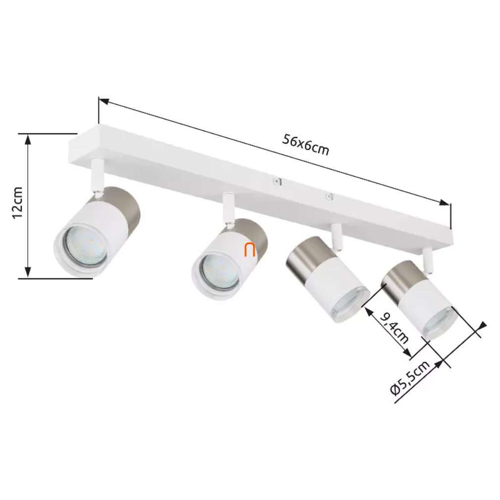A Brisbon Globo 57851-4 karos spot lámpa négy GU10 foglalattal rendelkezik, így cserélhető fényforrásokkal használható, amelyek nem tartozékai a terméknek. A lámpatest matt fehér színű, anyaga fém, alumínium és műanyag kombinációja, amely modern megjelenést biztosít. A mennyezeti lámpa 560 mm hosszú, 60 mm széles és 120 mm magas, névleges feszültsége 230 V, védettsége IP20. A termék tömege 1,18 kg, csomagolási méretei 7 cm x 13 cm x 59 cm. A lámpa négy különálló, állítható fejjel rendelkezik, amelyek lehetővé teszik a fény irányának egyedi beállítását. A Brisbon Globo 57851-4 ideális választás lehet lakásvilágítási célokra, különösen olyan helyiségekben, ahol több irányból szükséges a megvilágítás.