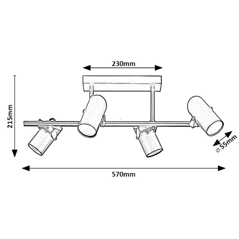 A Maximilian Rábalux 73044 karos spot lámpa négy GU10 foglalattal rendelkezik, melyek cserélhető fényforrásokkal szerelhetők fel. A lámpatest matt fekete, fém anyagból készült, modern formatervezéssel illeszkedik mennyezeti világításként különböző belső terekhez. A lámpa 230 V névleges feszültséggel működik, IP20 védettségi szinttel rendelkezik, így beltéri használatra alkalmas. A termék hossza 570 mm, szélessége 55 mm, magassága 215 mm, tömege 1,55 kg. A csomag nem tartalmaz fényforrást, így a kívánt fényáram, színhőmérséklet és teljesítmény a felhasználó igényei szerint választható meg. A lámpa négy különálló, állítható fejjel rendelkezik, amelyek lehetővé teszik a fény irányának pontos beállítását. A csomagolás méretei: 58 cm hosszú, 23 cm széles és 18 cm magas.