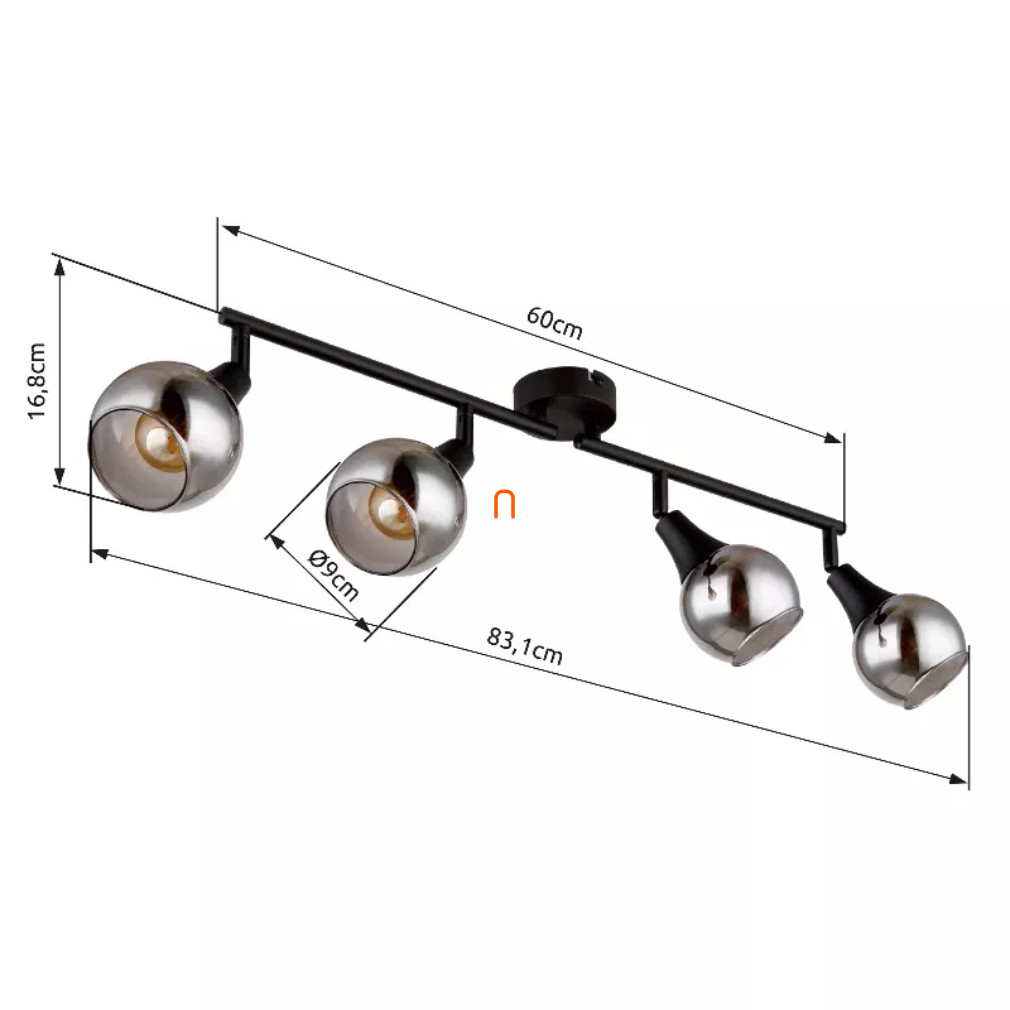 A Glyptar Globo 57904-4 karos spot lámpa négy E14 foglalattal rendelkezik, így cserélhető fényforrásokkal működtethető. A lámpatest matt fekete fém alapból és füstszínű üveg burából áll, amely modern megjelenést biztosít. A termék 230 V névleges feszültséggel üzemel, védettségi szintje IP20. Méretei 600 mm hosszúság, 90 mm szélesség és 168 mm magasság. A lámpa nem tartalmazza a fényforrást, így a fényáram, színhőmérséklet és teljesítmény a behelyezett izzóktól függ. A termék tömege 0,95 kg, gyártója a Globo.