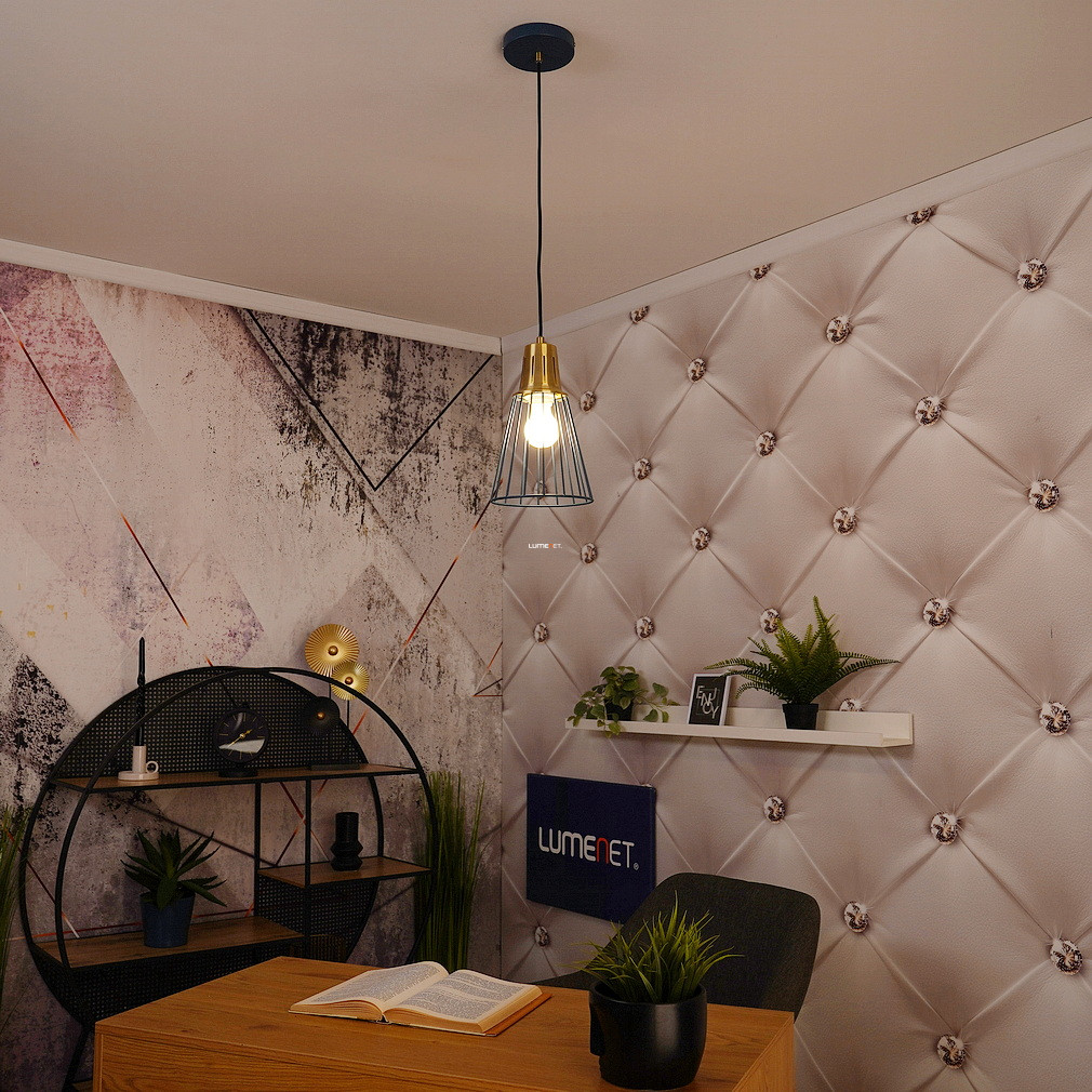 A Kaliope GTV OS-KAL-E27-25-DEC kék függesztett lámpa modern lakásvilágítási megoldás, amely egy darab E27 foglalattal rendelkezik. A lámpatest fém anyagból készült, kék és arany színű felülettel, amely elegáns megjelenést biztosít bármely beltéri térben. A termék tömege 0,86 kg, átmérője 180 mm. A fényforrás cserélhető, így a fényáram, fényszín, teljesítmény és színhőmérséklet a választott izzótól függően alakítható. A lámpa IP20 védettséggel rendelkezik, ezért kizárólag beltéri használatra alkalmas. A csomag nem tartalmaz fényforrást, a szükséges izzót külön kell beszerezni. A lámpa logisztikai kódja OS-KAL-E27-25-DEC, gyártója a GTV.