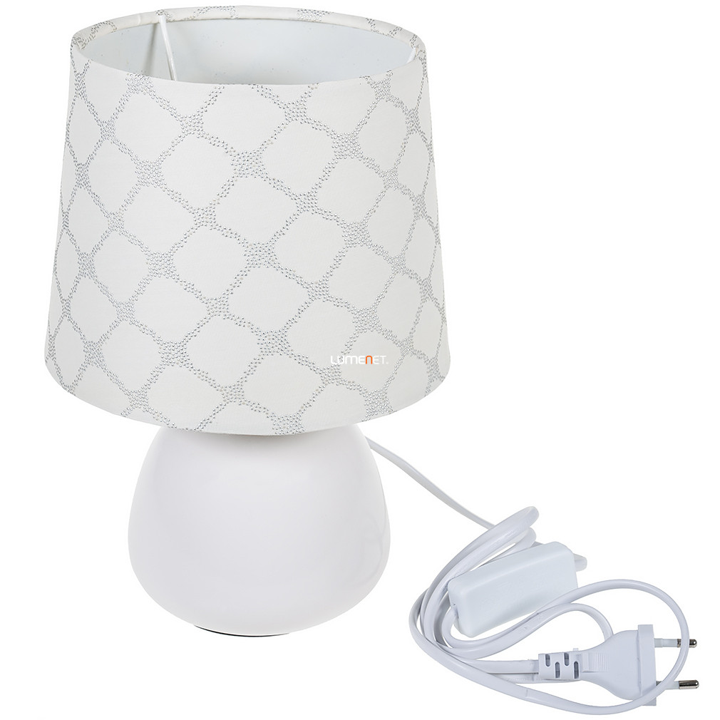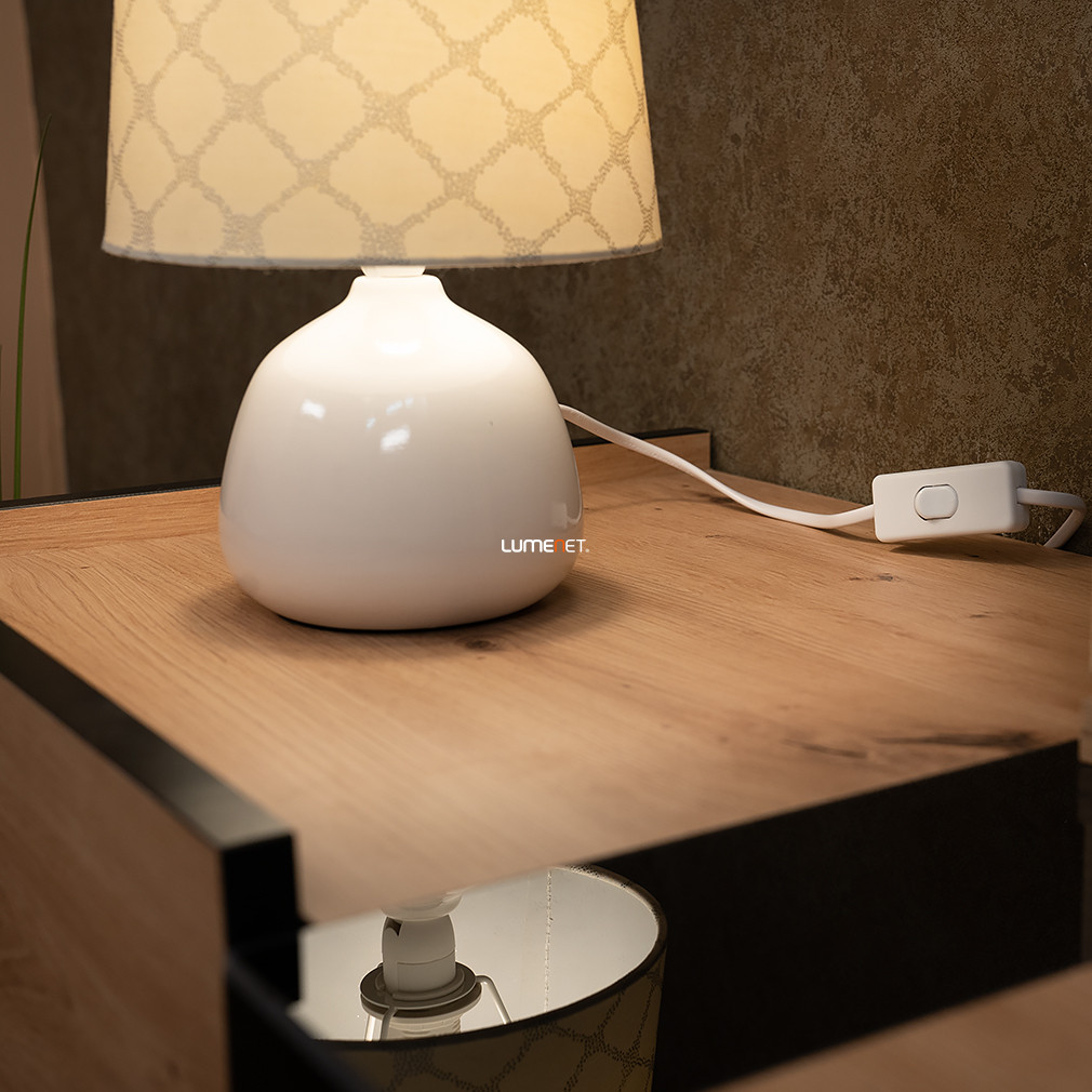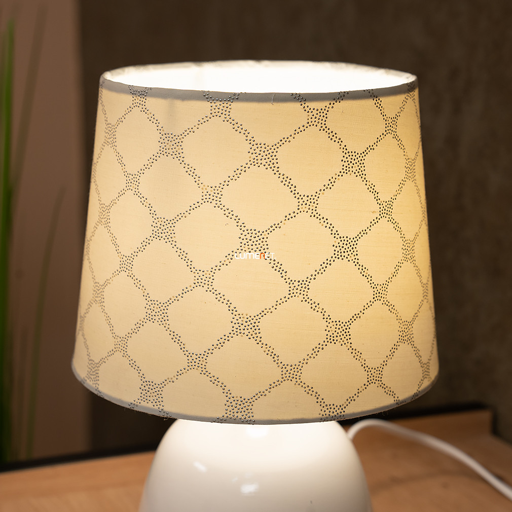A Kerámia asztali lámpa, 26 cm - Ellie Rábalux 4379 egy modern stílusú, fehér színű lakásvilágítási megoldás, amelyet a Rábalux gyárt. A lámpatest kerámia talppal és textil lámpaernyővel rendelkezik, összesen 26 cm magasságú és 18 cm átmérőjű. Egy darab E14 foglalattal van ellátva, amelybe cserélhető fényforrás illeszthető, a fényforrás nem tartozék. A lámpa nem szabályozható, működtetése zsinórkapcsolóval történik. IP20 védettségi besorolással rendelkezik, így beltéri használatra alkalmas. A termék tömege 0,6 kg, csomagolási méretei 19 cm szélesség, 18 cm hosszúság és 18 cm magasság. A logisztikai kódja 4379.