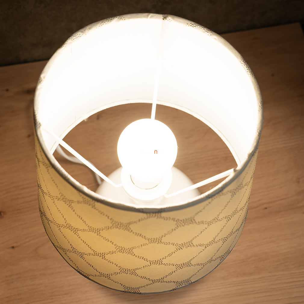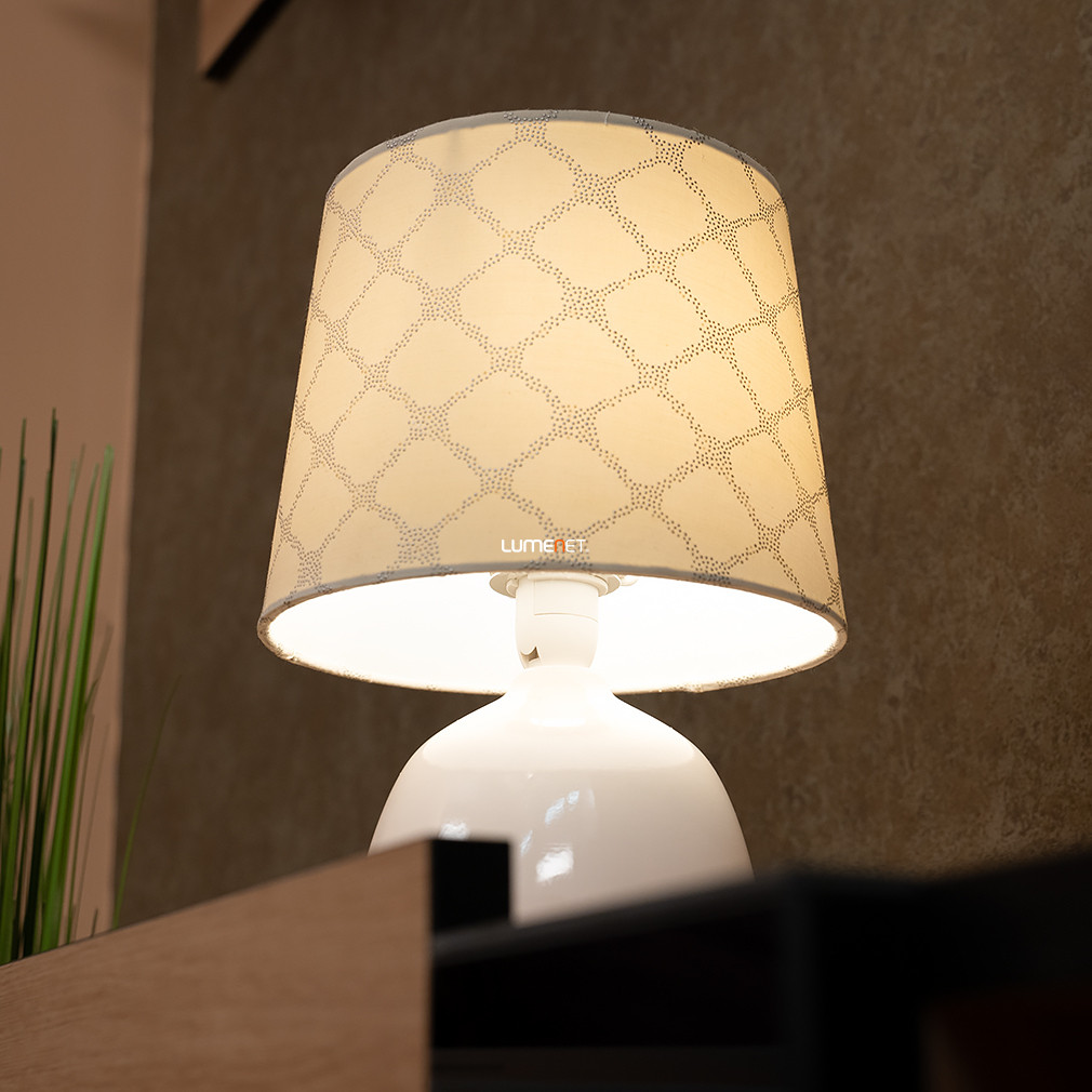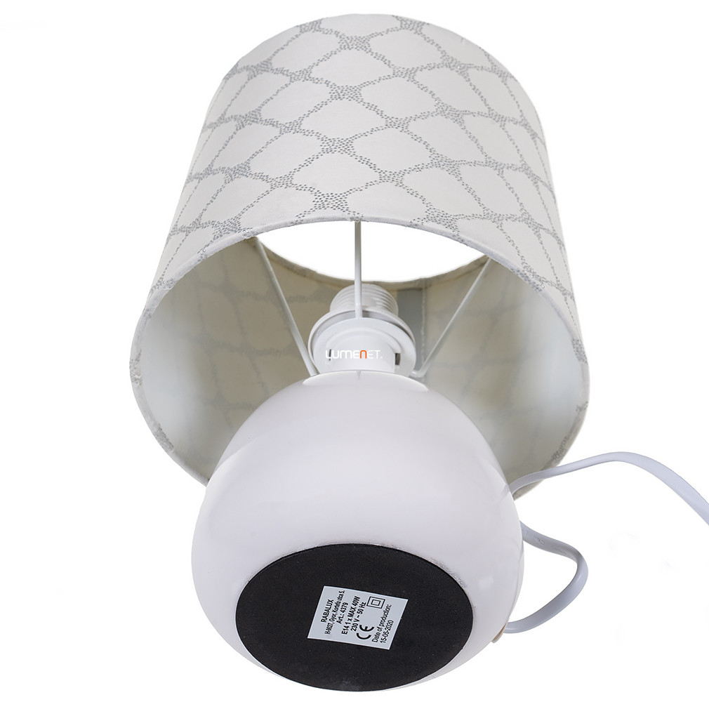 A Kerámia asztali lámpa, 26 cm - Ellie Rábalux 4379 egy modern stílusú, fehér színű lakásvilágítási megoldás, amelyet a Rábalux gyárt. A lámpatest kerámia talppal és textil lámpaernyővel rendelkezik, összesen 26 cm magasságú és 18 cm átmérőjű. Egy darab E14 foglalattal van ellátva, amelybe cserélhető fényforrás illeszthető, a fényforrás nem tartozék. A lámpa nem szabályozható, működtetése zsinórkapcsolóval történik. IP20 védettségi besorolással rendelkezik, így beltéri használatra alkalmas. A termék tömege 0,6 kg, csomagolási méretei 19 cm szélesség, 18 cm hosszúság és 18 cm magasság. A logisztikai kódja 4379.