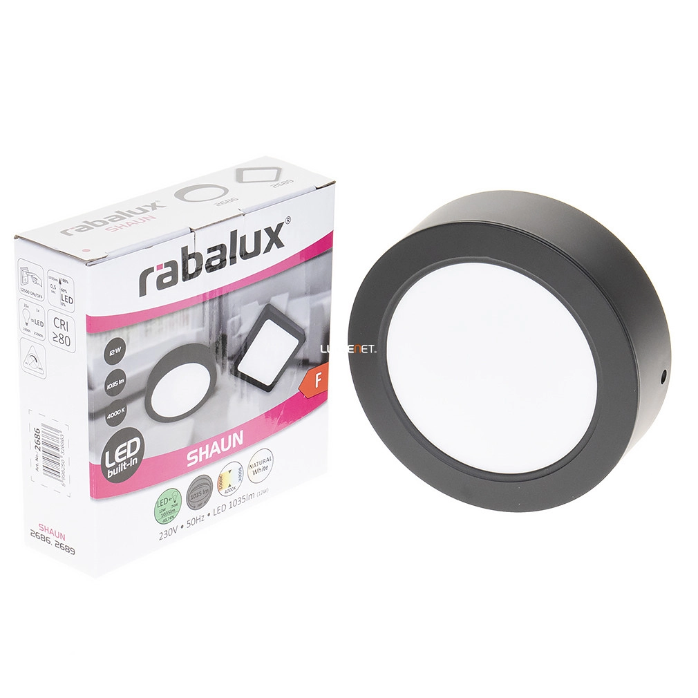 A Shaun Rábalux 2686 kerek mennyezeti LED lámpa funkcionális stílusban készült, modern lakásvilágítási megoldás. A lámpatest beépített 12 W-os LED modullal rendelkezik, amely 1035 lumen fényáramot biztosít hidegfehér, 4000 K színhőmérséklettel. A termék IP20 védettséggel bír, így beltéri használatra alkalmas. A lámpa átmérője 145 mm, magassága 45 mm, anyaga műanyag, színe fekete és fehér. Átlagos élettartama 25 000 óra, a fényforrás nem cserélhető, mivel a LED modul a lámpatest integrált része. A termék tömege 0,23 kg, csomagolása kompakt méretű. A mennyezeti lámpa megbízható, energiatakarékos világítási megoldást kínál otthoni környezetbe.