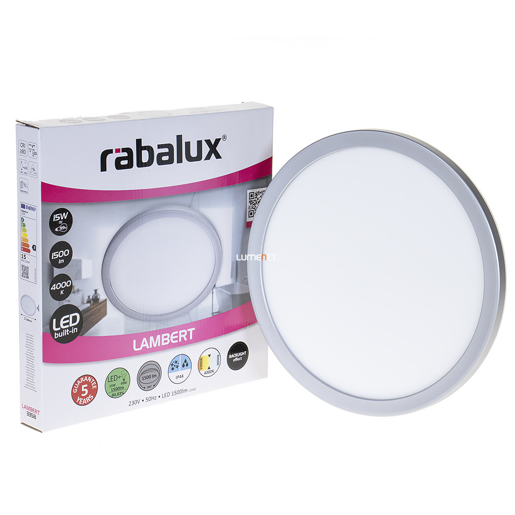 A Lambert Rábalux 3358 kerek mennyezeti LED panel modern kialakításával és 28 cm átmérőjével ideális választás lakásvilágításhoz. A lámpatest beépített, 15 W teljesítményű LED modullal rendelkezik, amely 1500 lumen fényáramot biztosít hidegfehér, 4000 K színhőmérséklet mellett. A termék IP44 védettséggel ellátott, így fokozottan ellenáll a nedvességnek és a por behatolásának. A lámpatest műanyagból készült, fehér és ezüst színben elérhető, átlagos élettartama 25 000 óra. Nem szabályozható, a fényforrás a lámpatest részét képezi. A panel magassága 28 mm, tömege 0,7 kg, csomagolási méretei: 4 cm szélesség, 29 cm hosszúság, 28 cm magasság. A gyártó Rábalux.