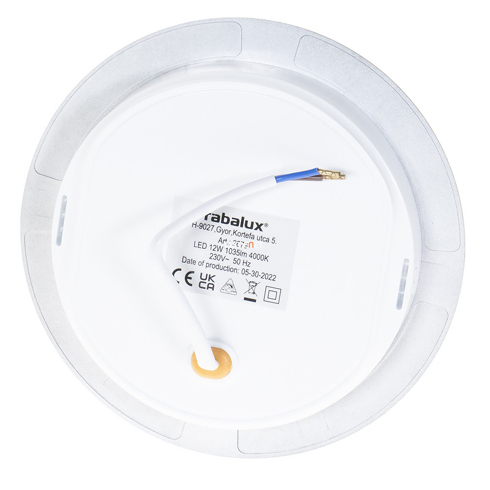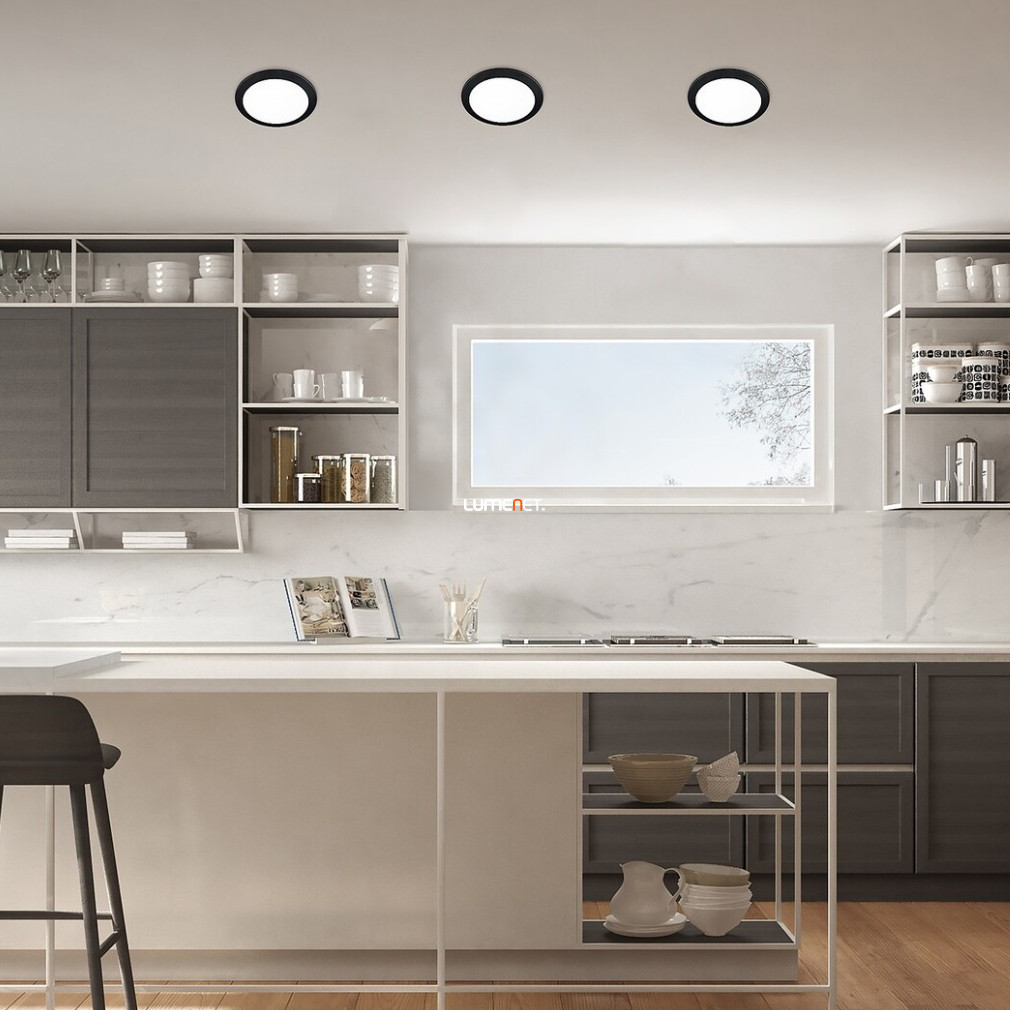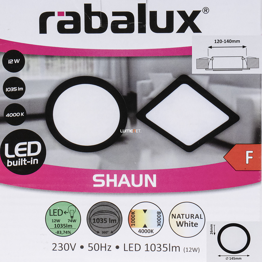 A Shaun Rábalux 2679 egy 12 wattos, kerek mennyezeti LED lámpa, amely ráépíthető és beépíthető kialakításának köszönhetően sokoldalúan alkalmazható lakásvilágítási megoldás. A lámpatest átmérője 14,5 cm, beépítési mélysége mindössze 26 mm, így alacsony álmennyezetekhez is ideális. A beépített LED modul hidegfehér, 4000 Kelvin színhőmérsékletű fényt bocsát ki, 1035 lumen fényárammal, amely hatékony és egyenletes megvilágítást biztosít. A lámpa IP20 védettségi szinttel rendelkezik, ezáltal beltéri használatra alkalmas. A termék kiváló minőségű műanyagból készült, fekete-fehér színkombinációban érhető el, és funkcionális stílusával modern enteriőrökbe is illeszkedik. Átlagos élettartama 25 000 óra, a csomag tartalmazza a beépített LED fényforrást is.