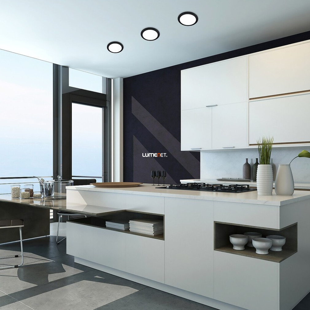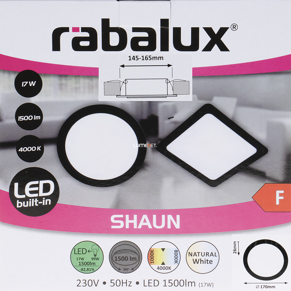 A Shaun Rábalux 2680 kerek mennyezeti LED lámpa 17 W teljesítménnyel és 1500 lumen fényárammal biztosítja a hidegfehér, 4000 K színhőmérsékletű világítást. A lámpatest átmérője 17 cm, beépítési mélysége 26 mm, így ráépíthető és süllyeszthető szerelésre is alkalmas. Funkcionális stílusú, fekete-fehér színű, tartós műanyagból készült, IP20 védettségi szinttel rendelkezik, beltéri használatra tervezve. A beépített LED modul hosszú, akár 25 000 órás átlagos élettartamot kínál, a fényforrás cseréje nem szükséges. A lámpa energiahatékony megoldást biztosít lakások, irodák vagy egyéb belső terek általános megvilágítására.