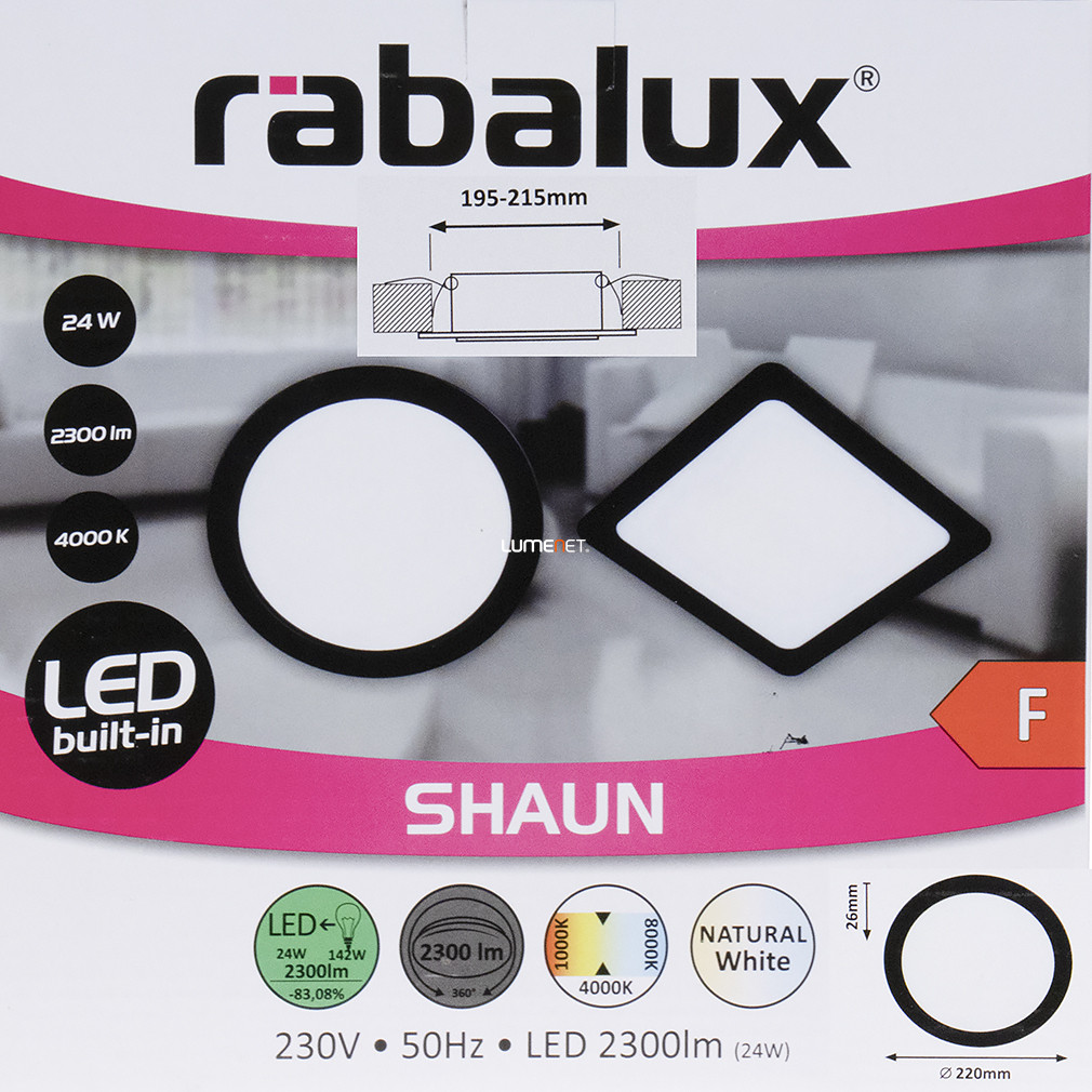 A Shaun Rábalux 2681 egy 24 wattos, kerek mennyezeti LED lámpa, amely ráépíthető és beépíthető kivitelben is alkalmazható. A lámpatest átmérője 22 cm, beépítési mélysége 26 mm, így szűkebb helyeken is könnyen elhelyezhető. A beépített LED modul 2300 lumen fényáramot biztosít, 4000 kelvines hidegfehér színhőmérséklettel, amely ideális funkcionális világítást nyújt lakóterekben. A lámpatest műanyagból készült, fekete-fehér színkombinációban, IP20-as védettséggel rendelkezik, így beltéri használatra alkalmas. Átlagos élettartama eléri a 25 000 órát. A termék csomagolásának méretei: 22 cm szélesség, 22 cm magasság és 3 cm hosszúság, tömege 0,31 kg. A LED fényforrás a lámpatest része, külön izzó vásárlása nem szükséges.