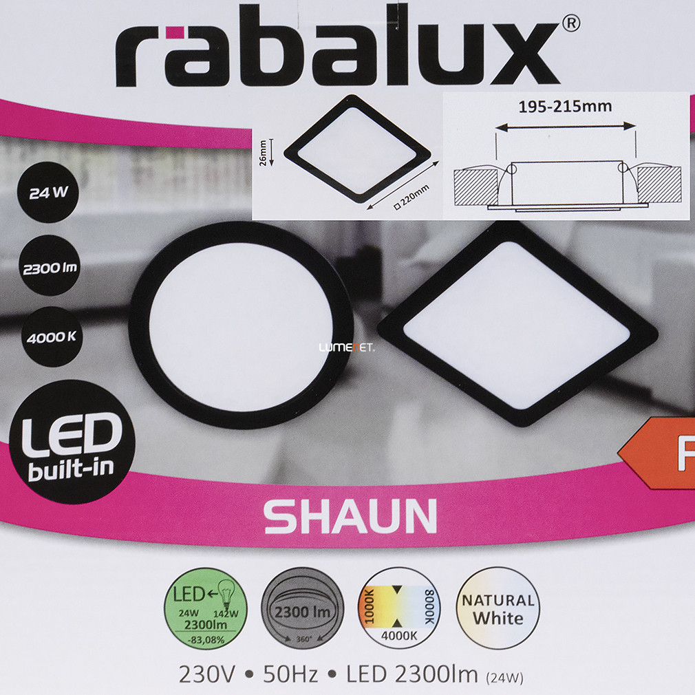 A Shaun Rábalux 2685 kerek mennyezeti LED lámpa 24 W teljesítménnyel és 2300 lumen fényárammal biztosítja a hatékony világítást lakóterekben. Hidegfehér, 4000 K színhőmérsékletű fényt bocsát ki, amely ideális modern, funkcionális környezetekhez. A lámpatest beépíthető és ráépíthető, így rugalmasan alkalmazható különböző mennyezeti szerkezeteken. A LED modul hosszú, 25 000 órás élettartamot kínál, a lámpatest IP20 védettséggel rendelkezik, amely beltéri használatra alkalmas. A termék mérete 22x22 cm, beépítési mélysége 2,6 cm, anyaga tartós műanyag, színe fekete-fehér. A lámpa energiatakarékos LED technológiával készül, amely beépített fényforrást tartalmaz, így azonnal használatra kész.
