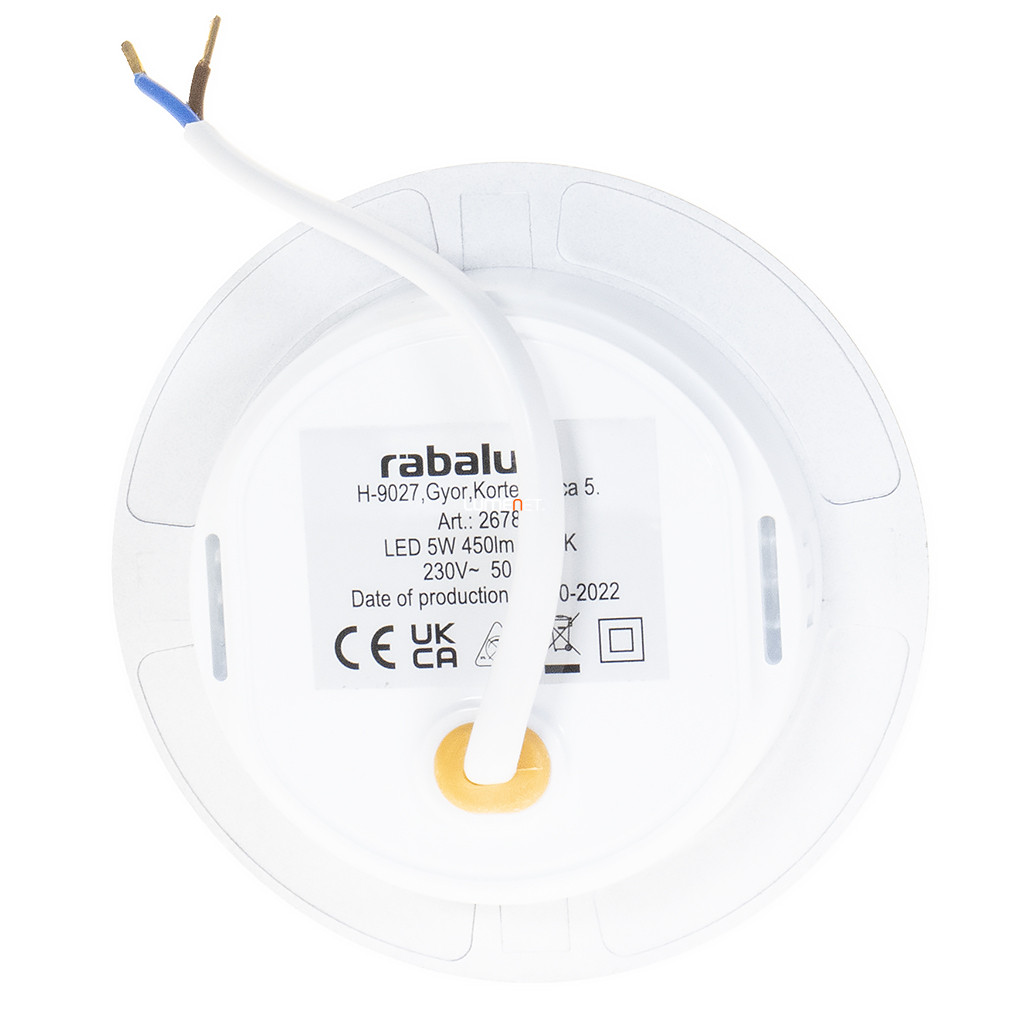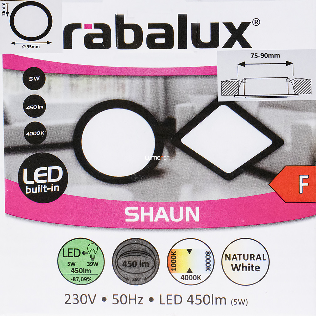 A Shaun Rábalux 2678 kerek mennyezeti LED lámpa 5 W teljesítménnyel és 450 lumen fényárammal, hidegfehér (4000 K) fényt biztosít. A lámpa átmérője 9,5 cm, beépítési mélysége 26 mm, így kompakt kialakításának köszönhetően ráépíthető és süllyeszthető szerelésre egyaránt alkalmas. A LED modul hosszú, akár 25 000 órás élettartamot kínál, a műanyag lámpatest fekete és fehér színekben készül. IP20 védettségével beltéri használatra optimalizált, funkcionális stílusával modern lakóterek és irodák energiatakarékos világítását teszi lehetővé. A termék tartalmazza a beépített LED fényforrást, így azonnal üzembe helyezhető.