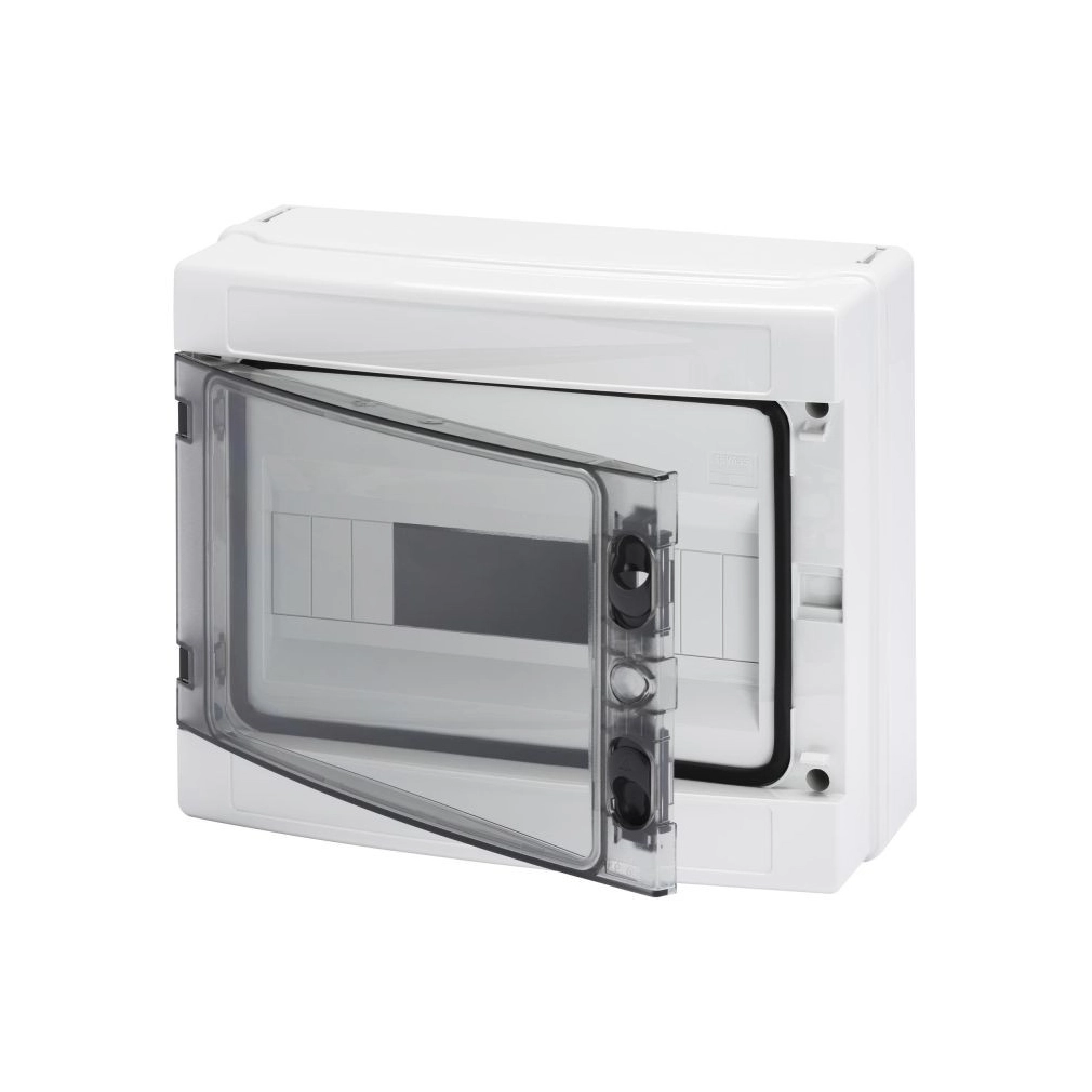 Kiselosztó falonkívüli 1soros, 12 modulos átlátszó ajtóval IP65 PE/N sínnel, 1000V DC, UV-álló GW40103BS