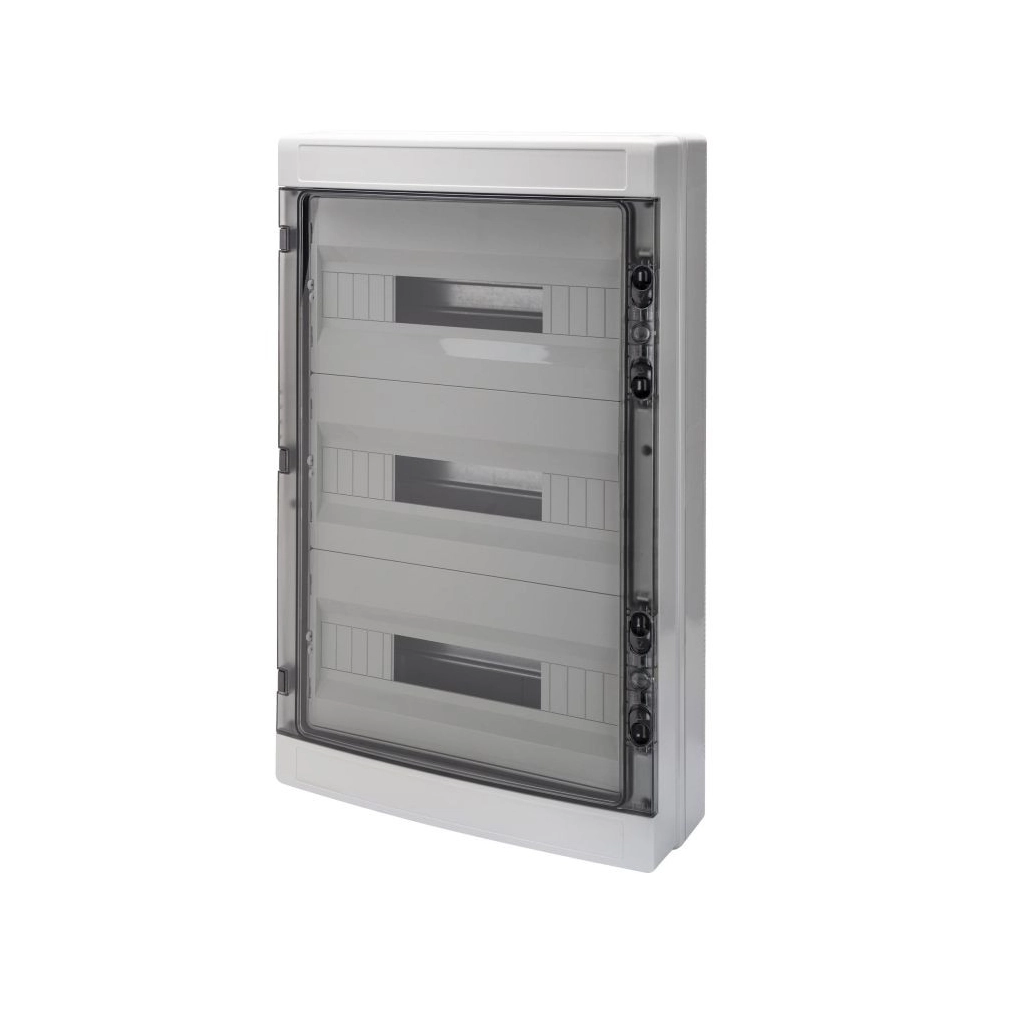 Gewiss kiselosztó falonkívüli 3soros, 54 modulos átlátszó ajtóval IP65 PE/N dupla sínnel 1000V DC, UV-álló GW40108BD