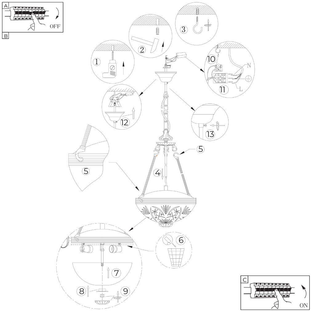 A függesztés hossza rövidíthető a mennyezeti takaró elemen található csavar segítségével, amennyiben 110 centiméternél rövidebb hosszúságban szeretné a felhasználó a helyiségbe belógatni a lámpát.
