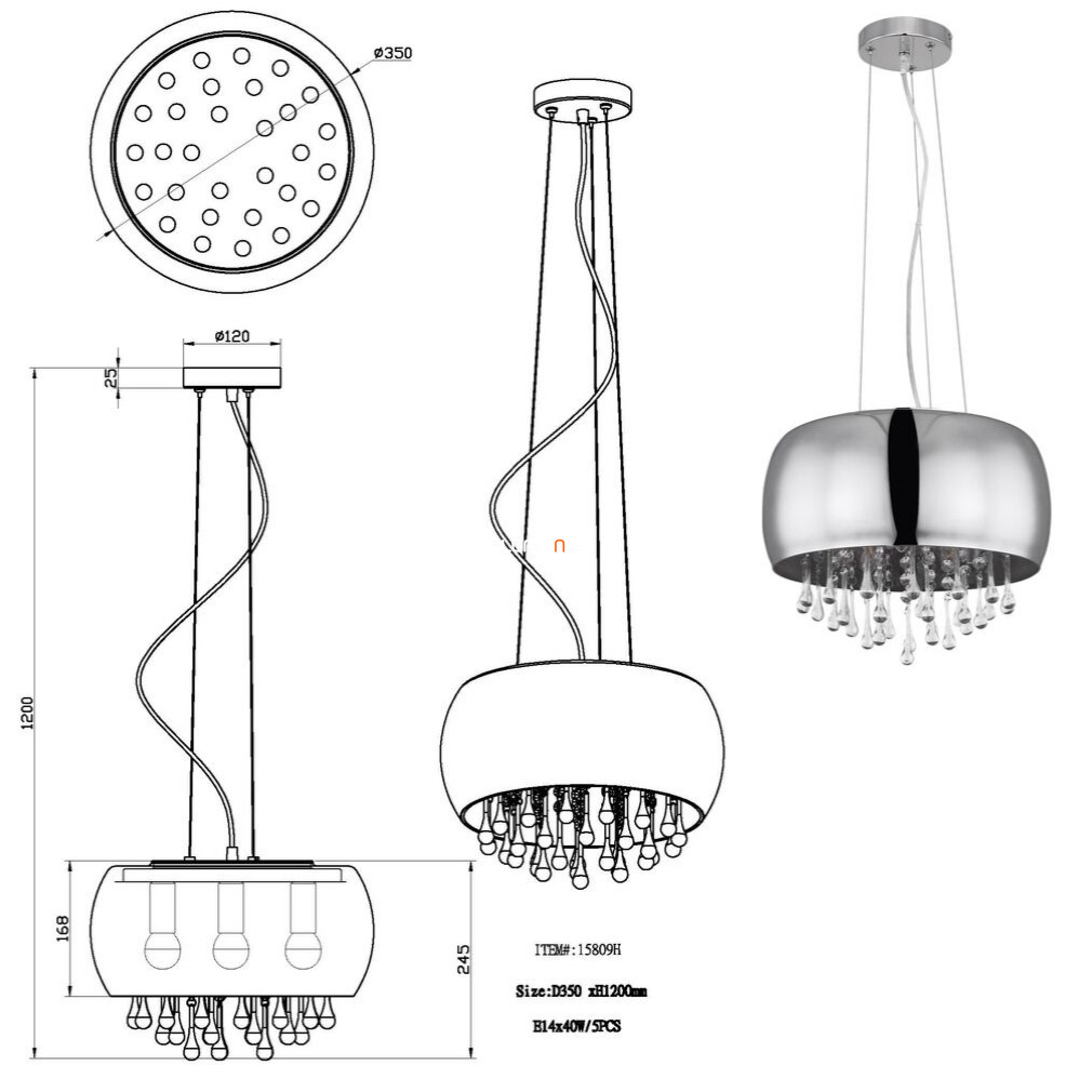 A Kristály csillár üvegburában csepp díszekkel, Kalla Globo 15809H modell, elegáns glamour stílusú függesztett lámpatest, amely öt darab E14 foglalattal rendelkezik. A lámpatest anyaga fém és üveg kristály, ezüst, áttetsző és füstszínű árnyalatokkal. A csillár átmérője 350 mm, maximális magassága 1200 mm. Az üvegbura csepp alakú kristálydíszekkel kombinálva különleges fénytörést biztosít. A fényforrások nem tartozékai a terméknek, cserélhető fényforrás használata szükséges. A csillár IP20 védettségi szinttel rendelkezik, kizárólag beltéri használatra alkalmas. A csomagolás mérete 27x40x40 cm, a termék tömege 4,29 kg. A csillárt a Globo gyártja.