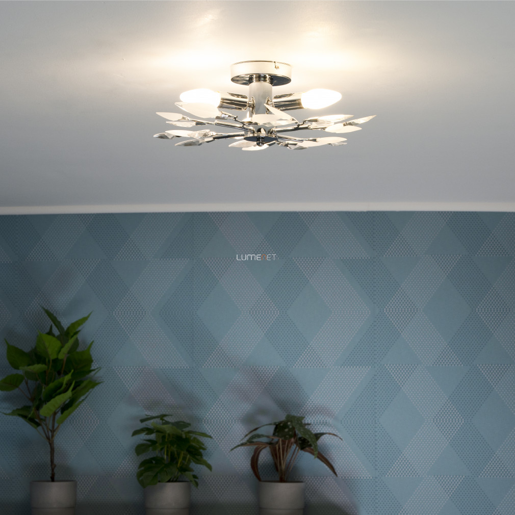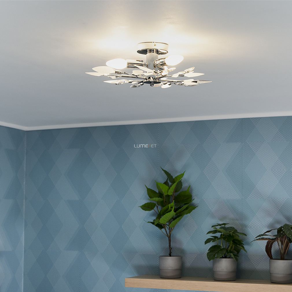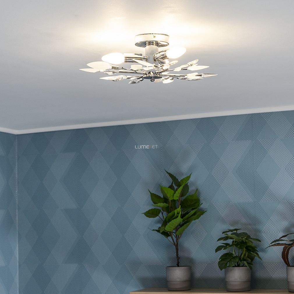 Ez a kristály leveles mennyezeti lámpa elegáns krómozott karokkal varázsolja el otthonodat, modern stílusával és cserélhető fényforrásával.