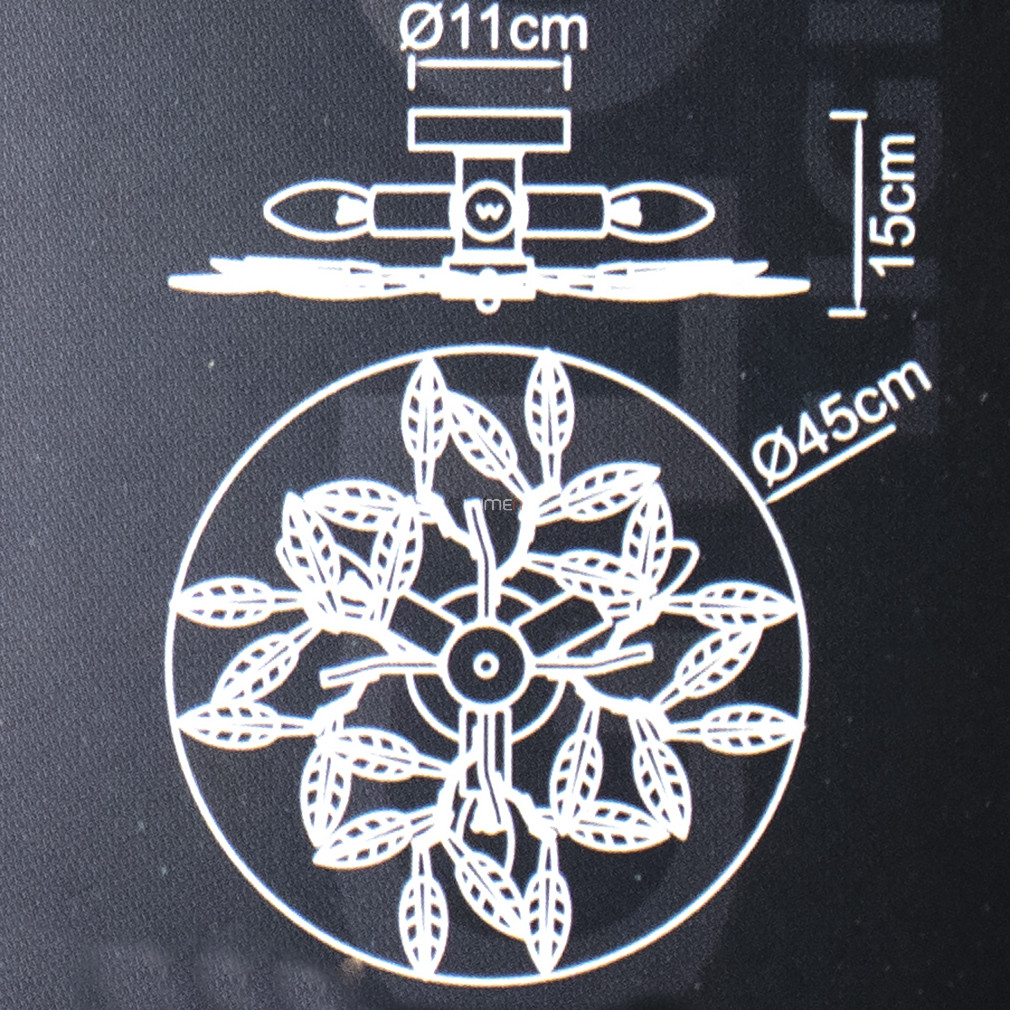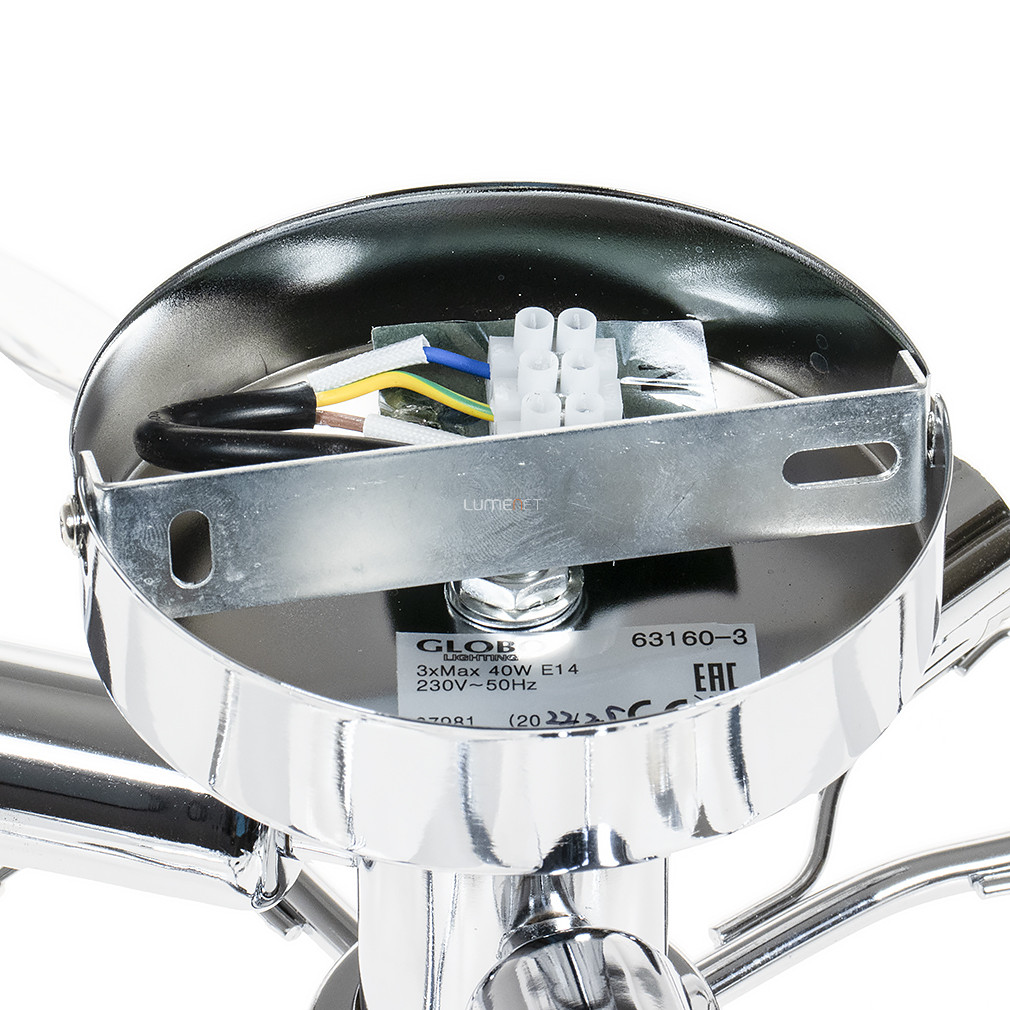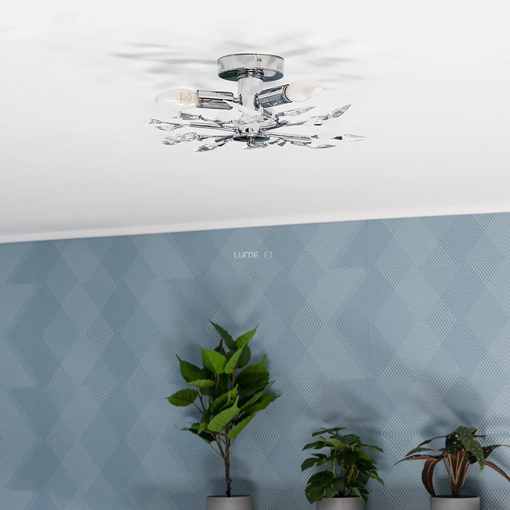 A Kristály leveles mennyezeti lámpa krómozott karokkal, Vida Globo 63160-3 modell, modern stílusú világítótest, amely három E14 foglalattal rendelkezik. A lámpatest fém és áttetsző akril kristály anyagokból készült, a krómozott karok elegáns megjelenést biztosítanak. Az átmérője 450 mm, magassága 140 mm. A lámpa cserélhető fényforrásokkal működik, a fényáram, fényszín, teljesítmény és színhőmérséklet a behelyezett izzóktól függ. A termék IP20 védettséggel rendelkezik, így beltéri használatra alkalmas. A csomag nem tartalmaz fényforrást. A gyártó a Globo.