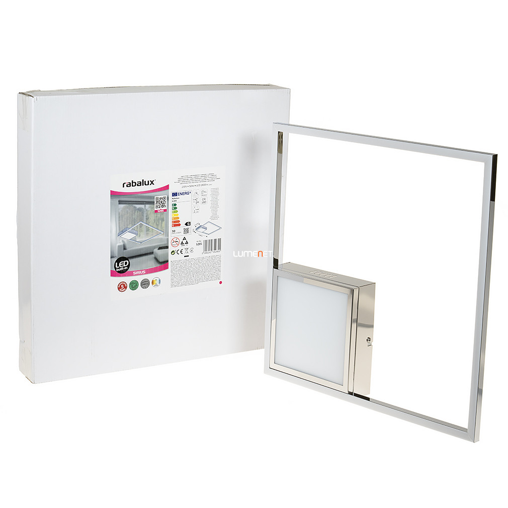 A Sirius Rábalux 5285 krómozott mennyezeti LED lámpa modern stílusban készült, amely 30 W teljesítményű LED modullal van felszerelve, és 1900 lumen fényáramot biztosít. A lámpatest hidegfehér, 4000 Kelvin színhőmérsékletű fényt bocsát ki, amely ideális általános lakásvilágításra. A termék fém és műanyag anyagok kombinációjával készült, króm és fehér színben. A mennyezeti lámpa nem szabályozható, IP20 védettséggel rendelkezik, így beltéri használatra alkalmas. A lámpatest 400 mm hosszú és széles, valamint 50 mm magas, súlya 1,3 kg. A csomagolás mérete 44x44x7 cm. A LED fényforrás beépített, így külön izzó beszerzése nem szükséges. A gyártó a Rábalux, a termék logisztikai kódja 5285.