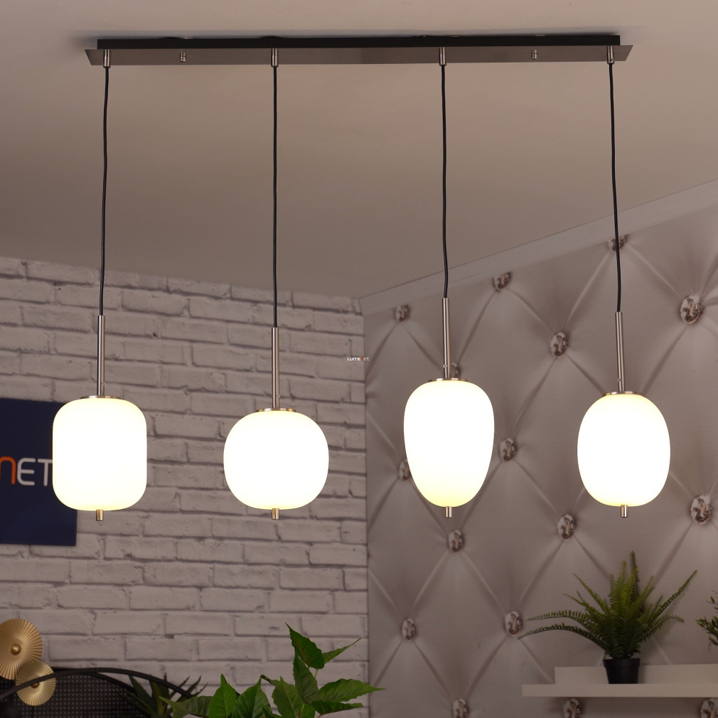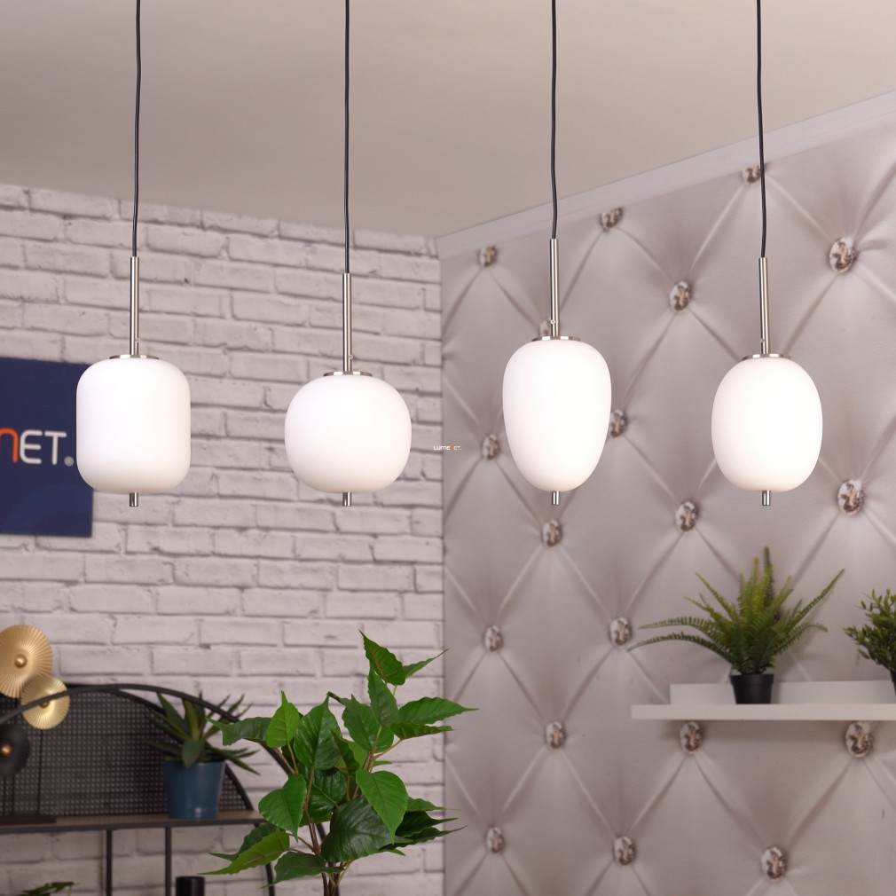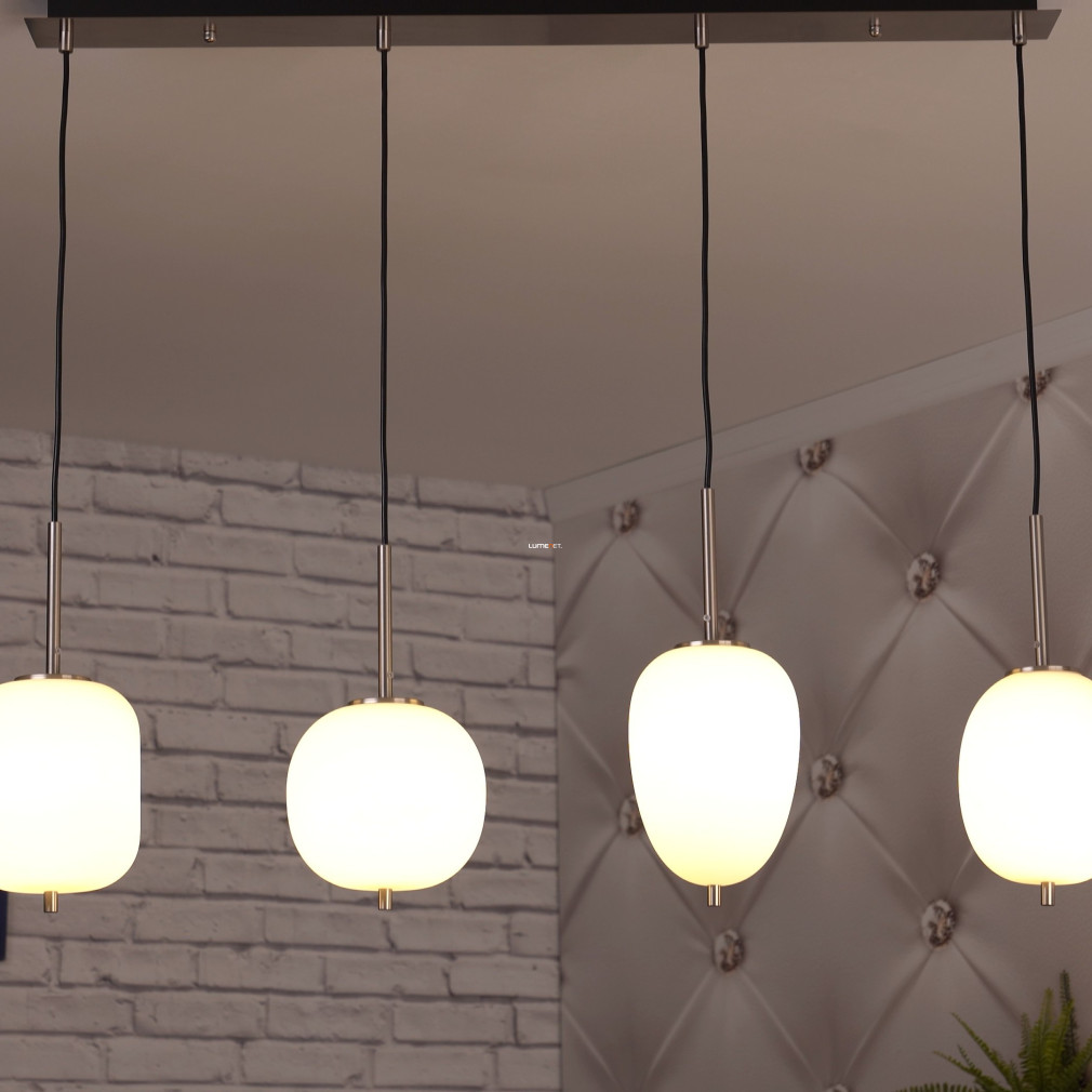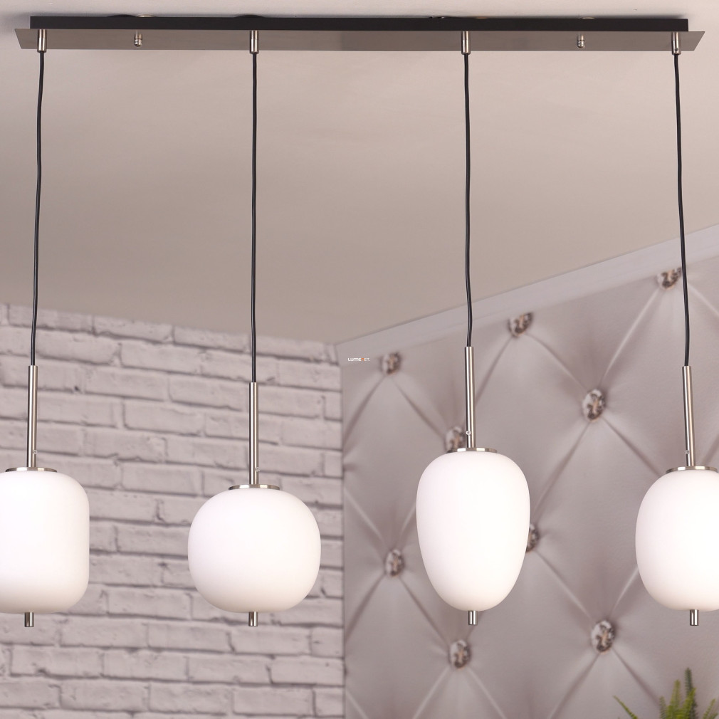 A Blacky I Globo 15345-4NO különböző búrás függesztett lámpa modern megjelenésével és négy darab E14 foglalattal kínál rugalmas világítási lehetőséget bármely lakótérben. A lámpatest nikkel és opál színű, üveg és fém anyaghasználata révén tartós és elegáns. A világítótest 1100 mm hosszúságú, 185 mm széles és 1200 mm magas, így nagyobb helyiségekben is jól érvényesül. A termék IP20 védettséggel rendelkezik, ezért beltéri használatra alkalmas. A fényforrás cserélhető, így a fényáram, színhőmérséklet és teljesítmény igény szerint módosítható. A csomag négy foglalatot tartalmaz, fényforrás nélkül szállítva. A lámpa tömege 4,19 kg, logisztikai kódja 15345-4NO. A gyártó a Globo.