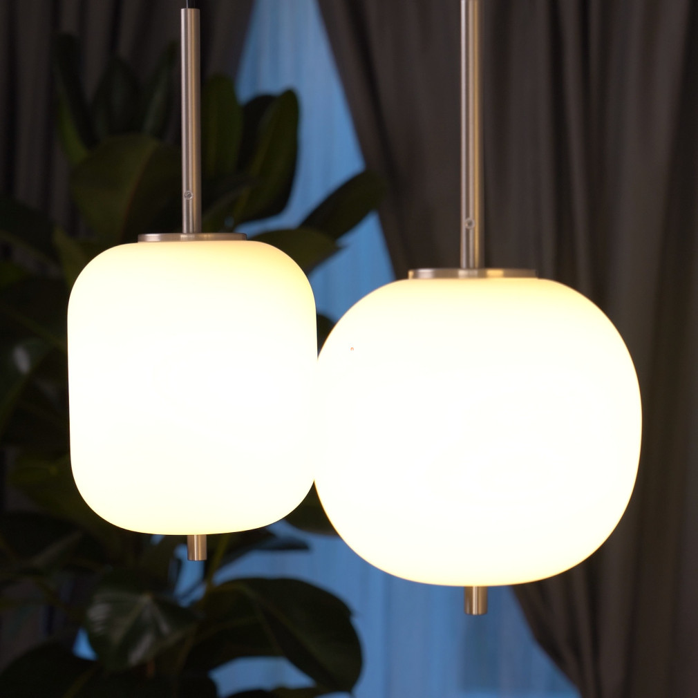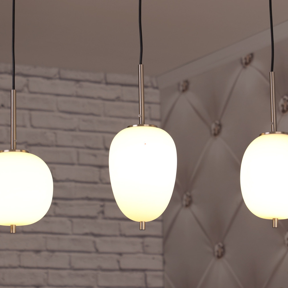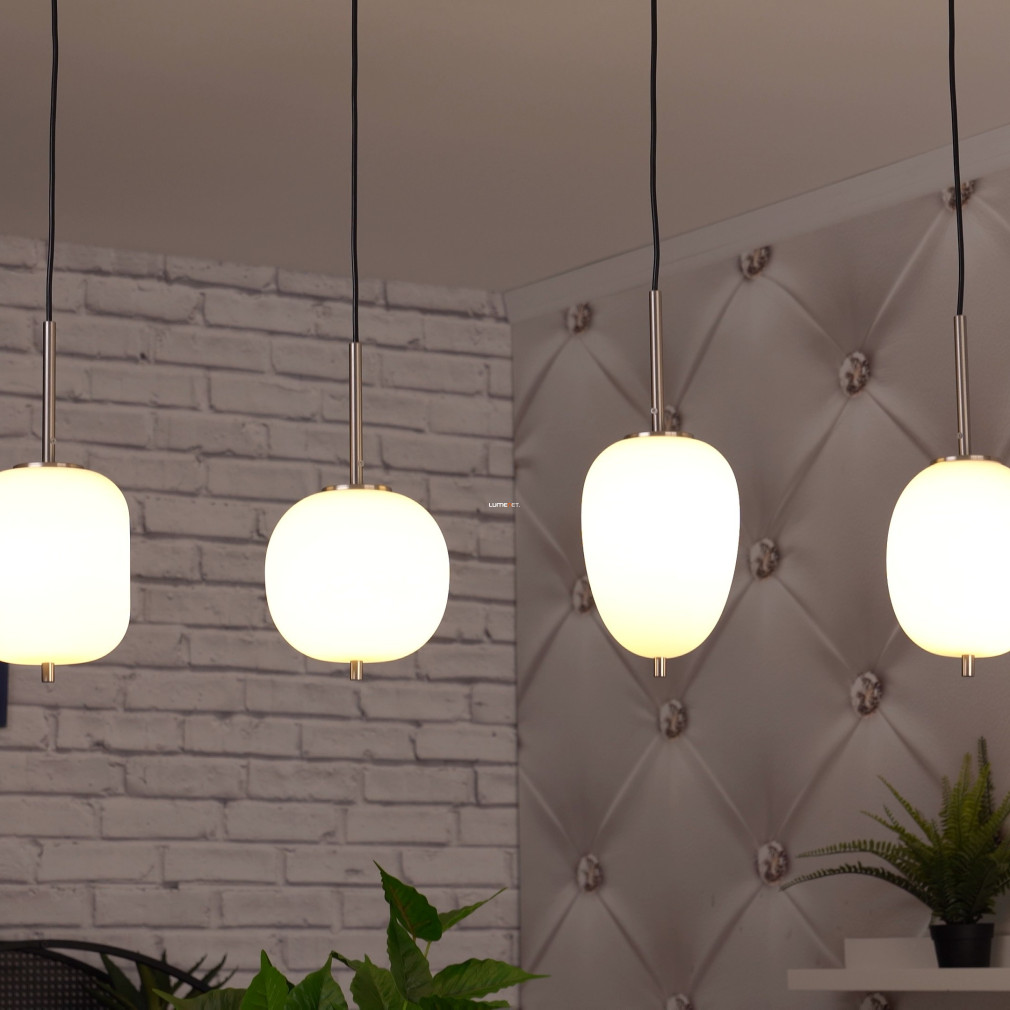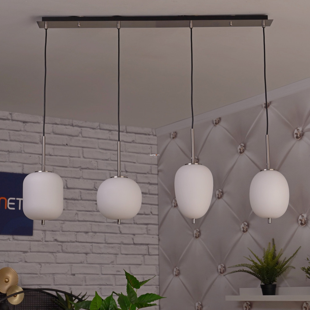 A Blacky I Globo 15345-4NO különböző búrás függesztett lámpa modern megjelenésével és négy darab E14 foglalattal kínál rugalmas világítási lehetőséget bármely lakótérben. A lámpatest nikkel és opál színű, üveg és fém anyaghasználata révén tartós és elegáns. A világítótest 1100 mm hosszúságú, 185 mm széles és 1200 mm magas, így nagyobb helyiségekben is jól érvényesül. A termék IP20 védettséggel rendelkezik, ezért beltéri használatra alkalmas. A fényforrás cserélhető, így a fényáram, színhőmérséklet és teljesítmény igény szerint módosítható. A csomag négy foglalatot tartalmaz, fényforrás nélkül szállítva. A lámpa tömege 4,19 kg, logisztikai kódja 15345-4NO. A gyártó a Globo.