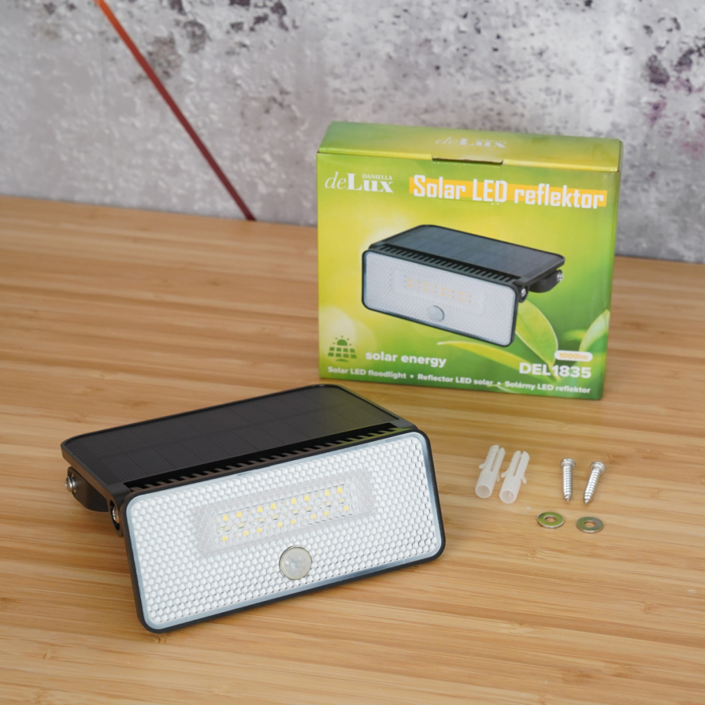 Kültéri napelemes fali LED reflektor mozgásérzékelővel és alkonykapcsolóval, 6500K 1000lm, IP54, fekete, 14,6x10,3x3,4 cm - deLux DEL1835
