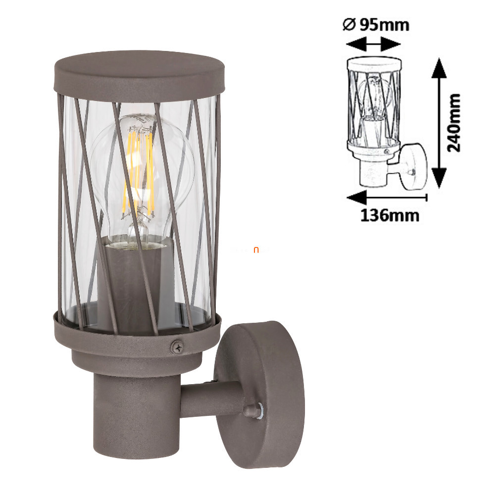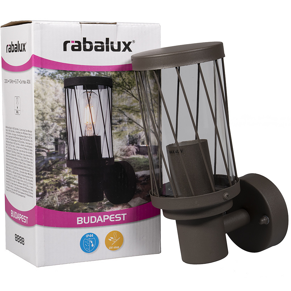 Budapest, Budapest, te csodás: biztosak vagyunk benne, hogy a Rábalux 8888 Budapest kültéri fali lámpája a te házad falán is remekül mutat majd! Az átlagosnál mutatósabb, fémből és műanyagból, barna színben készülő fali lámpa ideális bejárati ajtó, garázs vagy udvar megvilágítására. IP44 védett, tehát ellenáll a pornak és a fröccsenő víznek is.