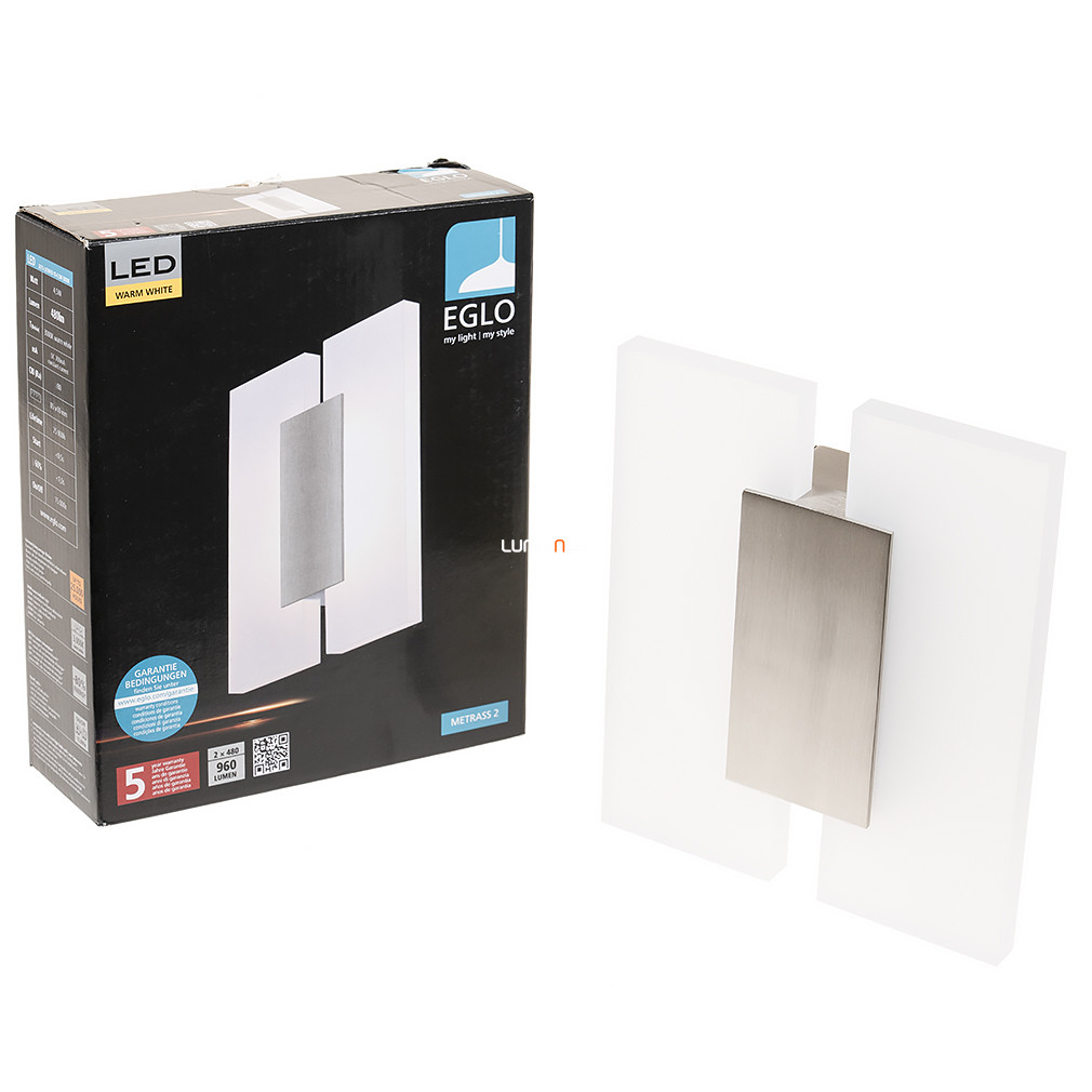 A LED fali lámpa, 17x20 cm - Metrass 2 Eglo 96043 modern kialakítású, fehér és nikkel színű alumínium és műanyag felhasználásával készült világítótest. A lámpatest 9 W-os LED modullal működik, mely 960 lumen fényáramot biztosít melegfehér, 3000 K színhőmérsékleten. A termék IP20 védettséggel rendelkezik, így beltéri használatra alkalmas. Kompakt méreteinek köszönhetően (170 mm hosszúság, 200 mm magasság) könnyen elhelyezhető különböző helyiségekben. A lámpatest tartalmazza a fényforrást, amely energiahatékony és hosszú élettartamú megoldást nyújt. Gyártója az EGLO.