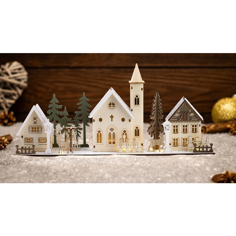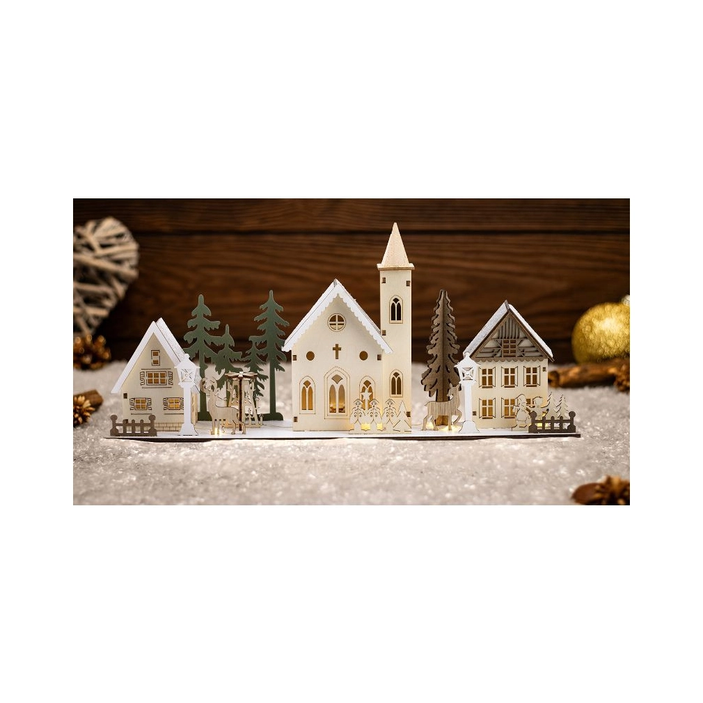 LED karácsonyi falu, fa, elemes Timer 6+18h, 10LED, 3000K, 2xAA CHRVILC10WW Tracon