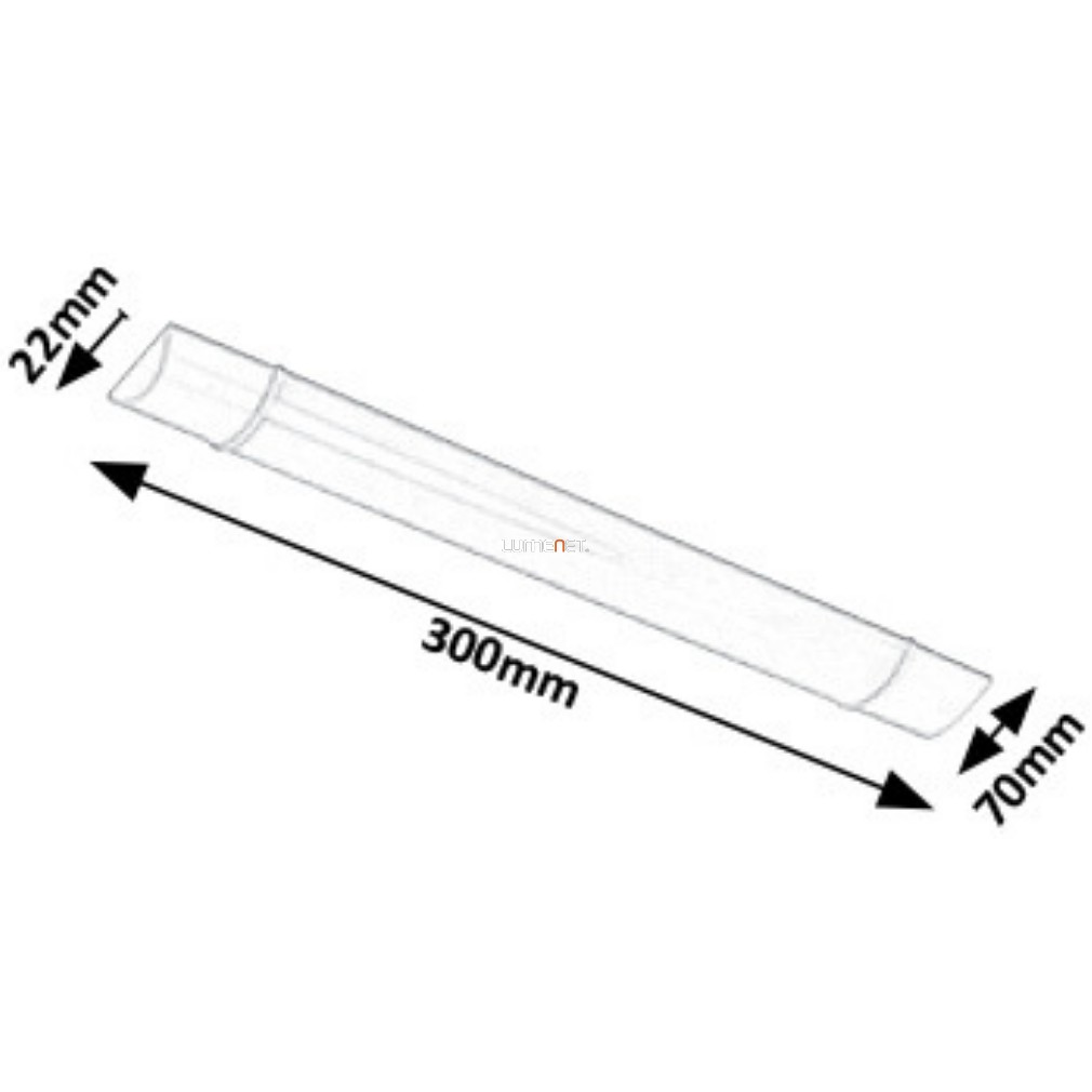 A Rábalux 1450 LED pultmegvilágító 10 W teljesítményű, hidegfehér fényt kibocsátó modern lámpatest, amelyet kifejezetten bútorok és pultok megvilágítására terveztek. A beépített LED modul 800 lumen fényáramot biztosít, 4000 K színhőmérséklettel, így természetes hidegfehér fényt nyújt. Az opál és ezüst színű, műanyagból készült test 300 mm hosszúságú, 22 mm széles és 70 mm magas, kompakt kialakítása révén könnyen integrálható különböző enteriőrökbe. A lámpa IP20 védettséggel rendelkezik, beltéri használatra alkalmas. Átlagos élettartama 20 000 óra, nem szabályozható, a fényforrást tartalmazza. A termék tömege 0,18 kg, csomagolási méretei 8x3x32 cm. A Rábalux által gyártott Batten Light kiválóan alkalmazható konyhapultok, szekrények vagy munkafelületek megvilágítására.