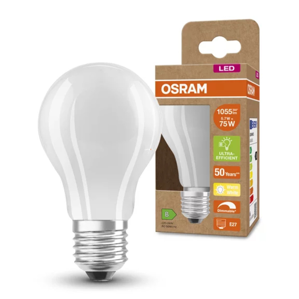 Osram E27 LED, 5,7 W, 1055 lm, melegfehér fényű , opál búra (Classic-B)