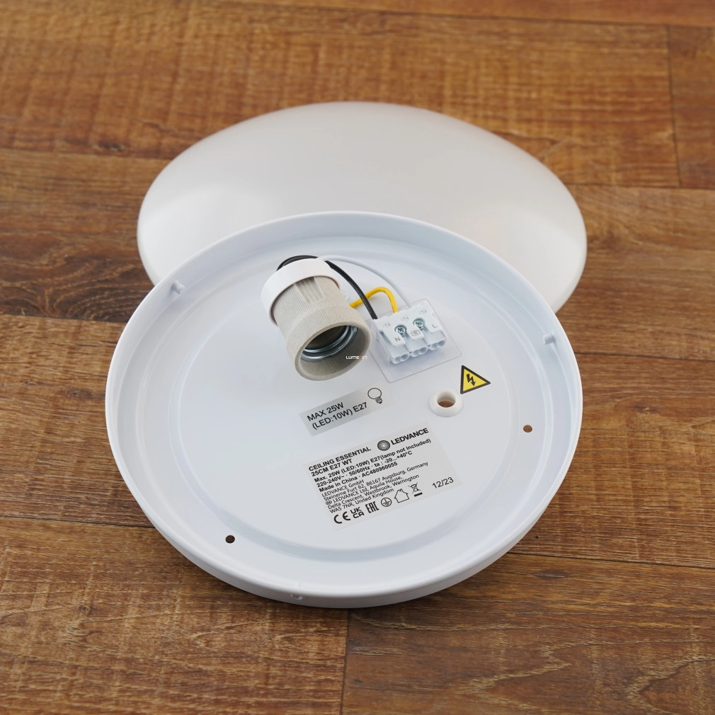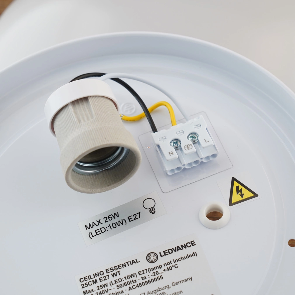 A Ledvance fali lámpa 25 cm-es átmérővel rendelkező, fehér színű, fémházas világítótest, amely E27-es foglalattal van ellátva. A lámpa egy darab cserélhető fényforrást fogad, amely nem része a csomagnak. A termék 220-240 V névleges feszültségen üzemel, maximális ütésállósága IK03, védettségi besorolása IP20. A lámpatest magassága 91 mm, tömege 0,305 kg, csomagolási méretei 28x28x9 cm. A lámpa nem szabályozható, és színhőmérséklete, valamint fényárama a behelyezett fényforrástól függ. A terméket a Ledvance gyártja.