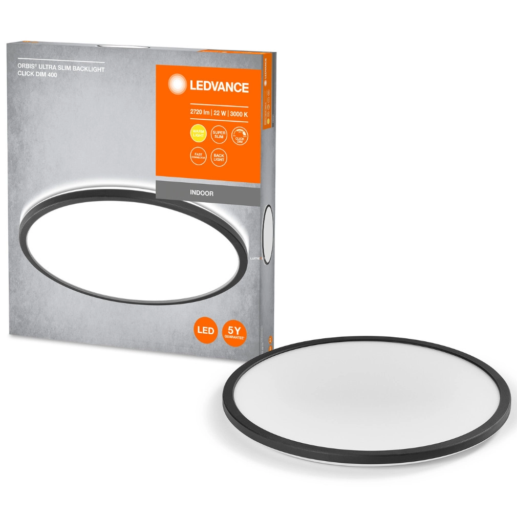 A Ledvance Orbis Ultra Slim Backlight mennyezeti LED lámpa egy modern, 22 wattos teljesítményű világítási megoldás, amelyet fekete színű, ultravékony kialakítással terveztek. A beépített LED modul 1740 lumen fényáramot biztosít, melegfehér, 3000 Kelvin színhőmérsékleten, 110 fokos sugárzási szöggel. A fényerő három lépésben, egyszerűen falikapcsolóval szabályozható, így a kívánt fényerő gyorsan beállítható. A lámpa műanyagból készült, átmérője 400 mm, magassága mindössze 27 mm, így diszkréten illeszkedik bármely mennyezetre. Energiahatékonysága 79 lm/W, színvisszaadási indexe (CRI) 80, élettartama eléri az 50 000 órát. A 220-240 V névleges feszültséggel működő lámpa IP20-as védettséggel rendelkezik, így beltéri használatra ideális.