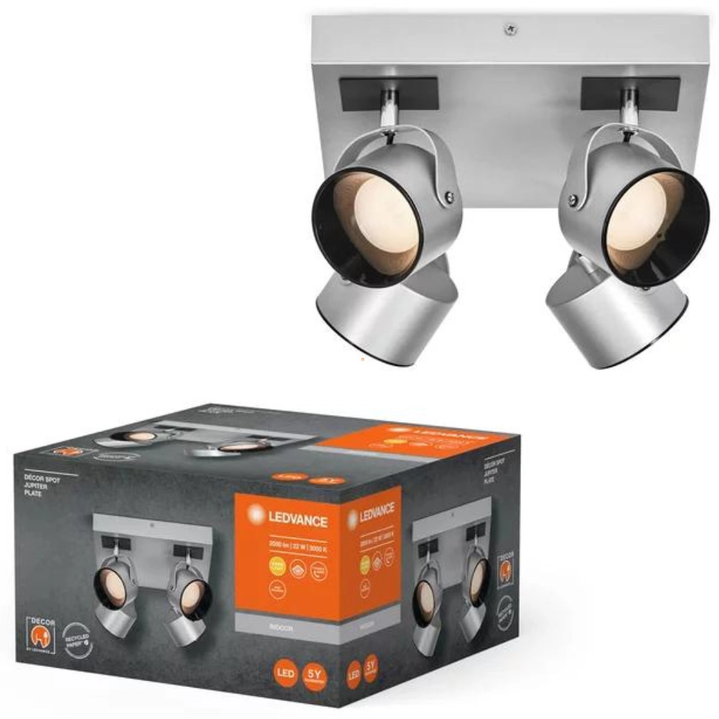 A Ledvance karos LED spot lámpa Jupiter modellje 26x26 cm-es méretben, modern ezüst színben készül, amelyet fém és műanyag alapanyagok kombinációja jellemez. A lámpatest beépített 22 W teljesítményű LED modullal működik, amely 750 lumen fényáramot biztosít melegfehér, 3000 K színhőmérséklettel. A 65°-os sugárzási szög és a 80-as színvisszaadási index pontos és kellemes fényhatást kínál. A termék IP20 védettséggel és IK03 ütésállósággal rendelkezik, így beltéri használatra alkalmas. Névleges feszültsége 220-240 V, átlagos élettartama eléri a 30 000 órát. A lámpa 260 mm hosszú, 260 mm széles és 155 mm magas, tömege 1,62 kg. A csomagolás méretei 31x32x18 cm. A Ledvance Jupiter LED spot lámpa energiatakarékos világítási megoldást kínál lakóterek mennyezeti megvilágításához.