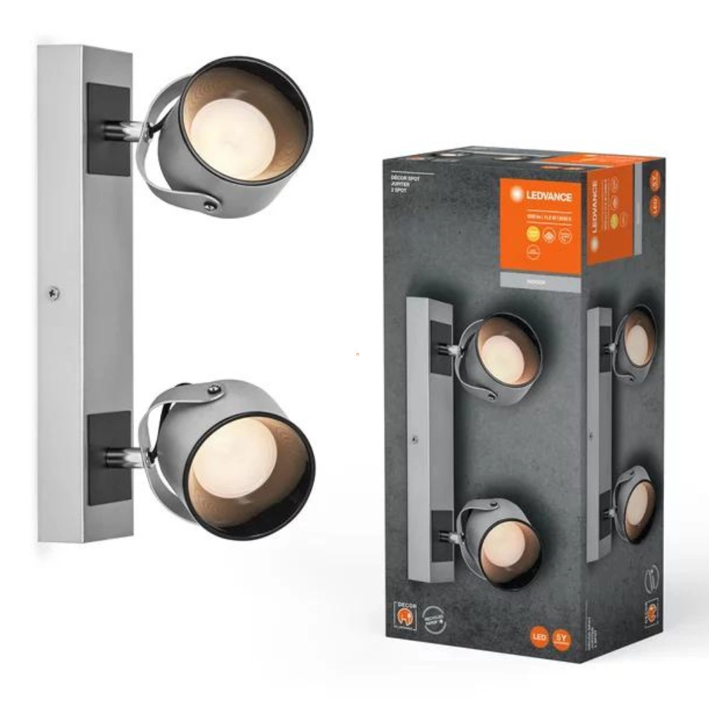 A Ledvance Jupiter karos LED spot lámpa modern, ezüst színű kivitelben készül, 11,5 wattos beépített LED modullal. A lámpatest 410 lumen fényáramot biztosít, 3000 Kelvin színhőmérsékletű, melegfehér fényt bocsát ki. A 65 fokos sugárzási szög precíz fényeloszlást tesz lehetővé, míg a színvisszaadási index (CRI) 80, amely természetes színmegjelenítést eredményez. A lámpa fő anyaga fém és műanyag, ütésállósága IK03 besorolású, védettsége IP20. Átlagos élettartama 30 000 óra, névleges feszültsége 220-240 V. Méretei: 300 mm hosszúság, 83 mm szélesség, 150 mm magasság. A termék tartalmazza a fényforrást, LED modul formájában, és lakásvilágítási célokra, főként mennyezeti elhelyezéshez tervezett.
