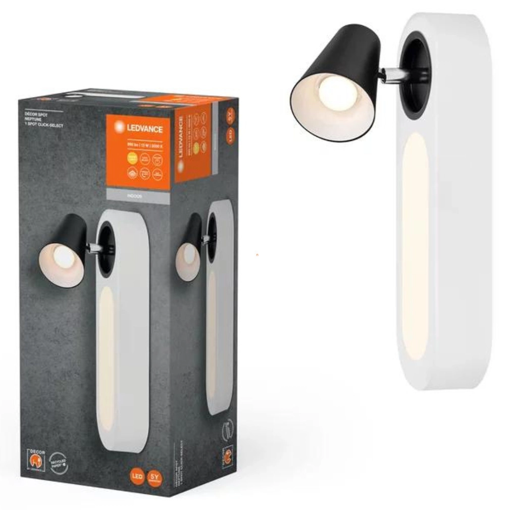 A Ledvance LED spot lámpa (Neptun) egy modern, falra szerelhető világítótest, amely 13 W teljesítményű beépített LED modullal működik. A lámpatest 490 lumen fényáramot biztosít, melegfehér, 3000 K színhőmérséklettel, amely ideális hangulatot teremt lakótérben. A termék fehér színű, fém és műanyag anyagból készült, sugárzási szöge 101 fok, színvisszaadási indexe (CRI) 80, így a megvilágított tárgyak természetes színeiben jelennek meg. A lámpa 220-240 V névleges feszültséggel működik, IP20 védettséggel és IK03 ütésállósággal rendelkezik, ami beltéri használatra teszi alkalmassá. Átlagos élettartama eléri a 30 000 órát, méretei: 90 mm hosszúság, 137 mm szélesség, 300 mm magasság. A csomagolás mérete 13x17x37 cm, a termék tömege 0,79 kg. A Ledvance által gyártott lámpa logisztikai kódja: 4058075828308.