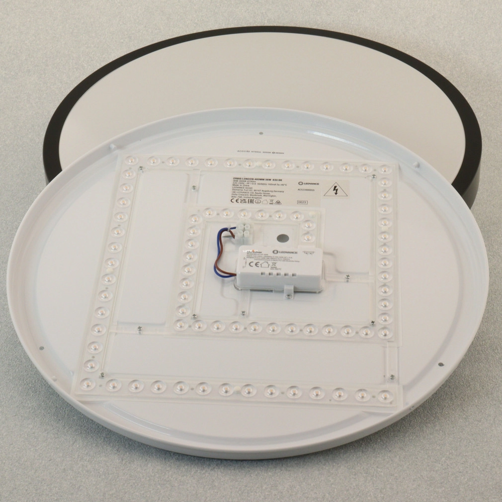 A Ledvance mennyezeti LED lámpa 36 W teljesítményű, beépített LED modullal rendelkező világítótest, amely 2200 lumen fényáramot biztosít melegfehér, 3000 K színhőmérsékleten. A lámpa színvisszaadási indexe CRI 80, sugárzási szöge 120°, fényhasznosítása 61 lm/W. A termék átmérője 480 mm, magassága 95 mm, anyaga fém, színe fekete. Névleges feszültsége 220-240 V, védettségi besorolása IP20, átlagos élettartama 50 000 óra. A lámpatest tartalmazza a LED fényforrást, csomagolási méretei 50x10x50 cm, tömege 1,2 kg. A gyártó a Ledvance.