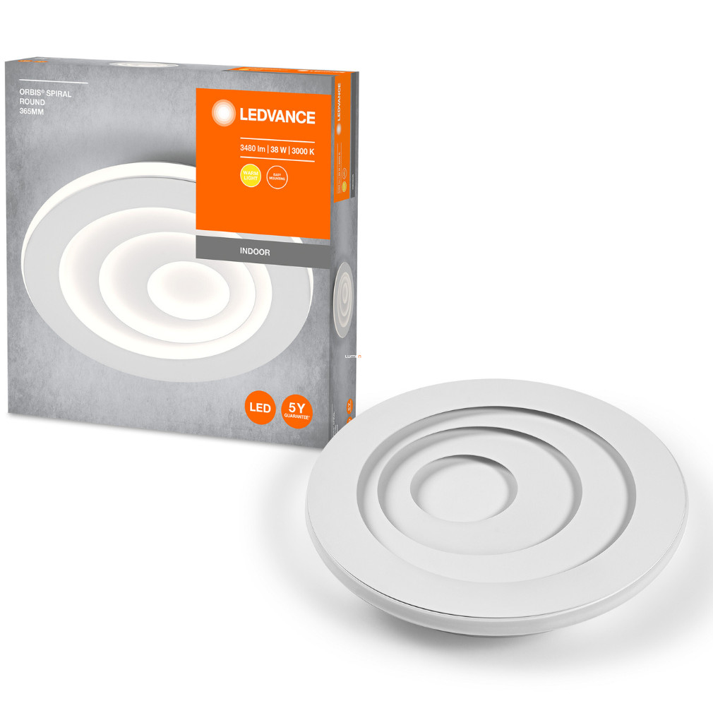 A Ledvance mennyezeti LED lámpa (Orbis Spiral Round) 38 W teljesítménnyel és 1900 lumen fényárammal biztosítja a melegfehér, 3000 K színhőmérsékletű világítást. A beépített LED modul 220-240 V névleges feszültségen működik, nem szabályozható, és 80-as színvisszaadási indexet kínál. Az acélból készült, fehér színű lámpatest 365 mm átmérővel és 56 mm magassággal rendelkezik, IP20 védettségi szinttel. Az energiatakarékos LED technológia és a 30 000 óra átlagos élettartam hosszú távú, megbízható működést tesz lehetővé. A lámpatest fényhasznosítása 50 lm/W, a csomagolás méretei pedig 42x42x7 cm. A termék gyártója a Ledvance.