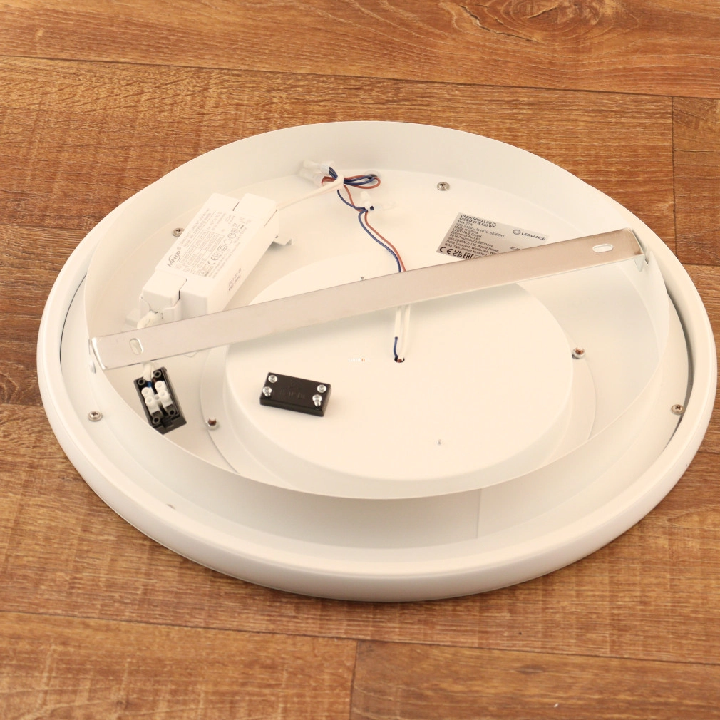 A Ledvance Orbis Spiral Round mennyezeti LED lámpa fehér színben 27 W teljesítménnyel és beépített LED modullal rendelkezik, amely 1600 lumen fényáramot biztosít melegfehér, 3000 K színhőmérsékleten. A lámpatest acélból készült, átmérője 400 mm, magassága 50 mm, védettségi besorolása IP20, így beltéri használatra alkalmas. A termék színvisszaadási indexe CRI 80, fényhasznosítása 59 lm/W, átlagos élettartama eléri a 30 000 órát. Nem szabályozható, névleges feszültsége 220-240 V. A csomagolás méretei: 46 cm hosszú, 46 cm magas és 7 cm széles, tömege 2,32 kg. A lámpa beépített LED fényforrást tartalmaz, amely nem cserélhető.