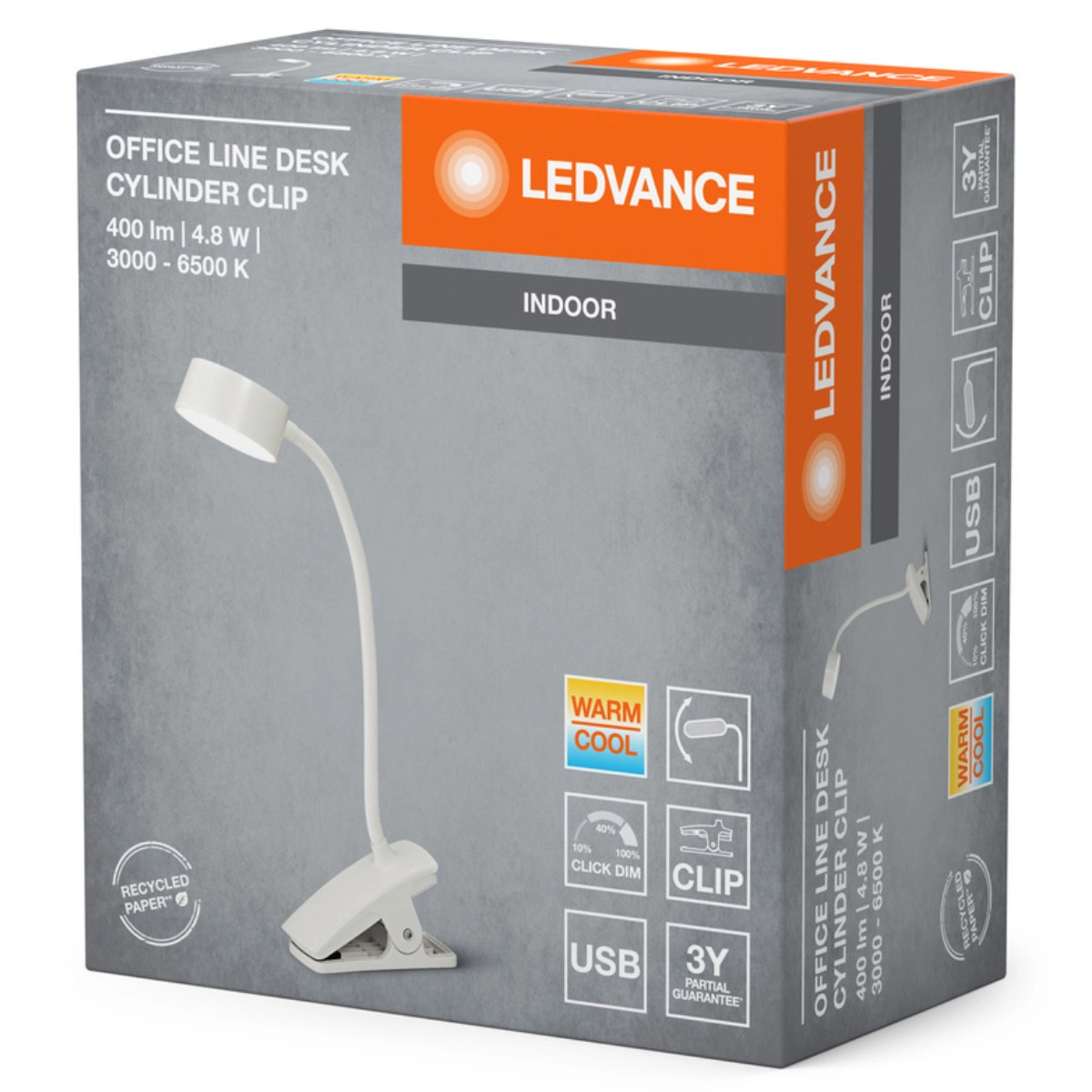 A Ledvance Office Line Desk Cylinder Clip lámpa 1 méter hosszú USB töltőkábellel érkezik, így könnyen csatlakoztatható számítógéphez, laptophoz vagy bármilyen USB tápforráshoz. A termék megfelel a CE és EAC szabványoknak, és akár 25.000 óra élettartamot kínál (L70/B50 @ 25 °C). A hosszú élettartam alatt akár 15.000 kapcsolási ciklust is kibír, így évekig megbízható társad lesz a mindennapokban. A 4099854388552 cikkszámú modell nem tartalmaz higanyos alkatrészeket, a beépített fényforrás pedig nem cserélhető.