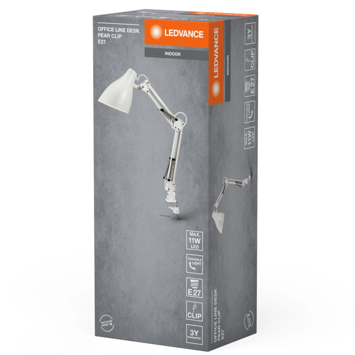 A Ledvance Office Line Desk Pear Clip E27 White egy klasszikus dizájnú, fehér színű csiptetős asztali lámpa, amely tökéletes választás otthoni irodák, íróasztalok és különböző életterei számára. A termék a Ledvance minőségi kínálatának része, amely professzionális világítástechnikai megoldásokat kínál mind otthoni, mind irodai környezetbe.