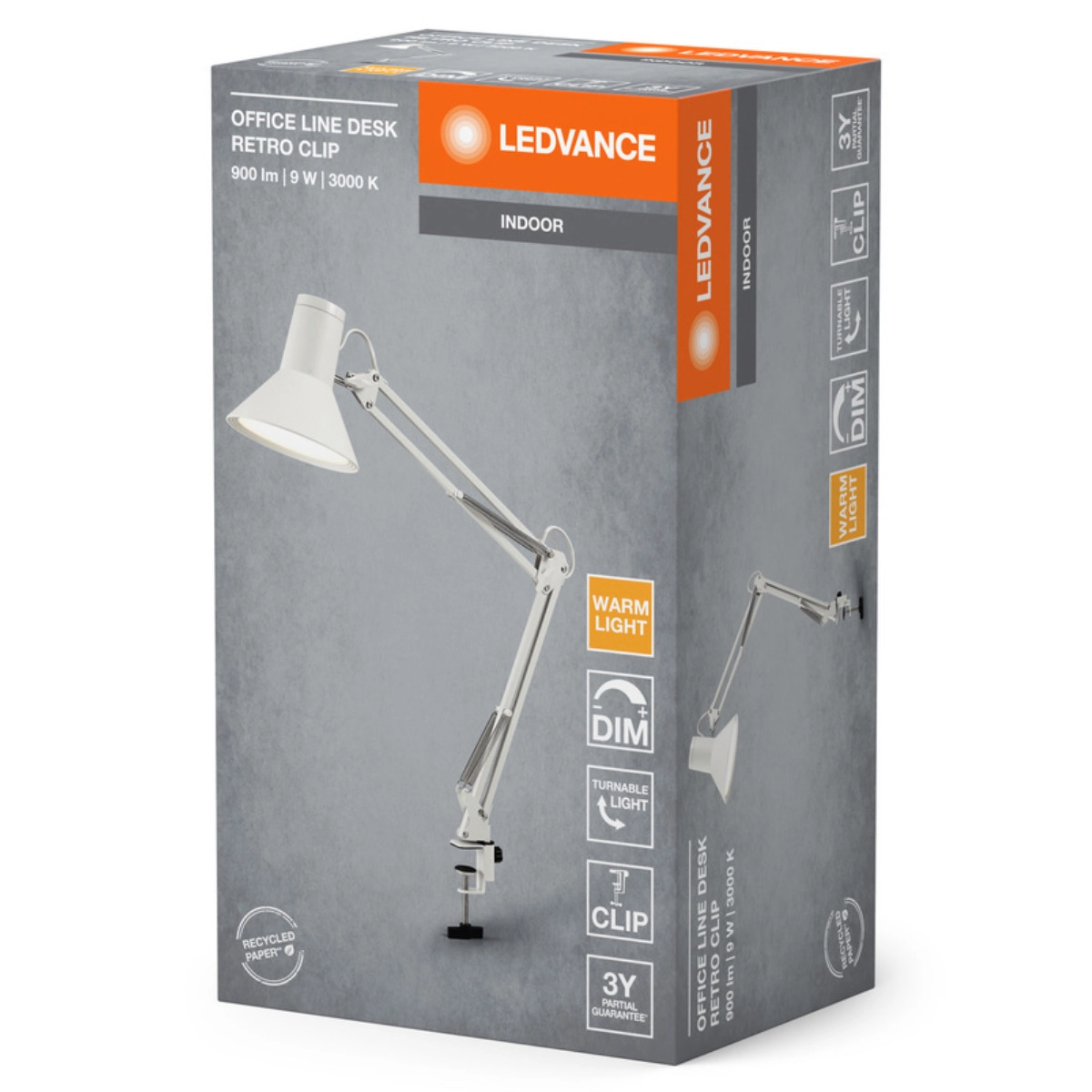 A Ledvance Office Line Desk Retro Clip egy retró stílusú asztali lámpa hosszú karral és csipeszes rögzítéssel. A lámpa feje forgatható, így a fényforrás egyénileg irányítható. Két csuklóponttal rendelkezik, ami lehetővé teszi a pozíció pontos beállítását. A hosszú karnak köszönhetően nagy terület világítható meg. A csipesz mechanizmussal könnyen rögzíthető különböző típusú bútorokhoz.
