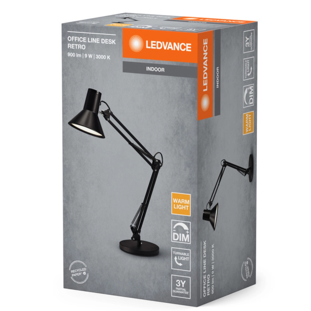 A Ledvance Office Line Desk Retro 9W 830 Dimmable Black egy elegáns, retró stílusú asztali lámpa, amely tökéletes választás otthoni és irodai környezetbe egyaránt. Ez a fekete színű, hosszú karral rendelkező világítótest egyesíti a klasszikus dizájnt a modern technológiával, hogy megfelelő megvilágítást biztosítson asztalodhoz, íróasztalodhoz vagy bármilyen munkafelülethez.