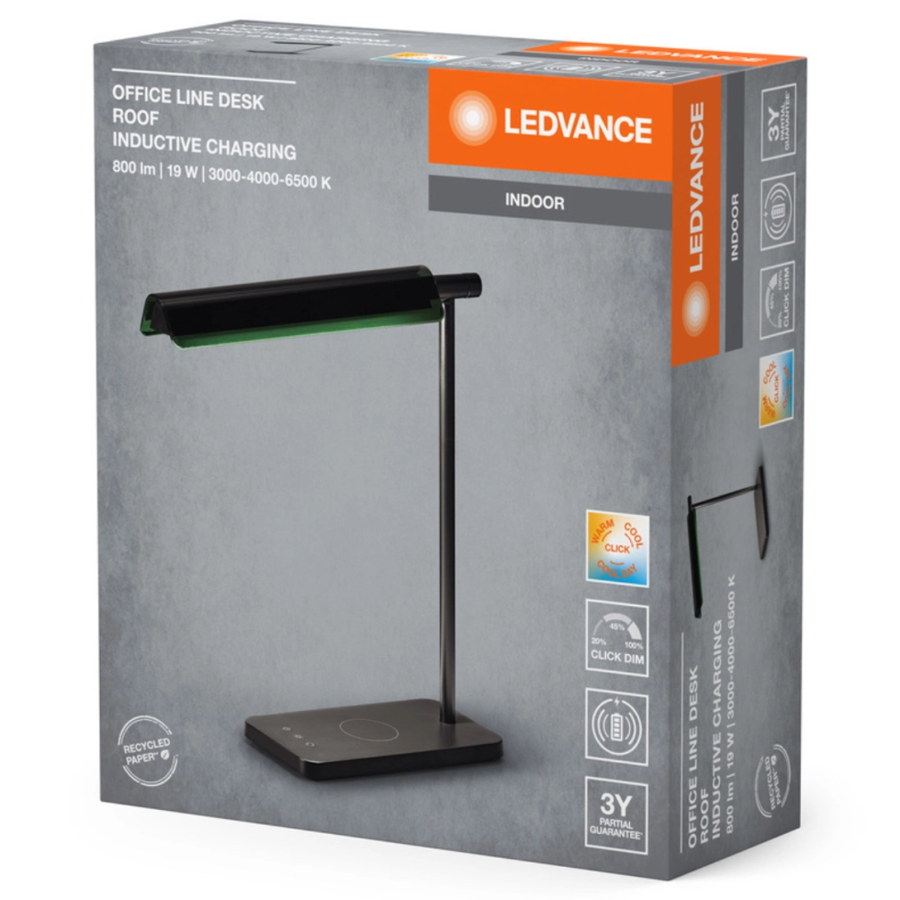 A Ledvance Office Line Desk Roof Inductive Charging egy asztali lámpa indukciós töltési funkcióval, 3-fokozatú fényerőszabályozással és színhőmérséklet-állítási lehetőséggel. A termék időtlen dizájnnal és forgatható lámpa fejrésszel rendelkezik, ami lehetővé teszi a fény egyéni irányítását.