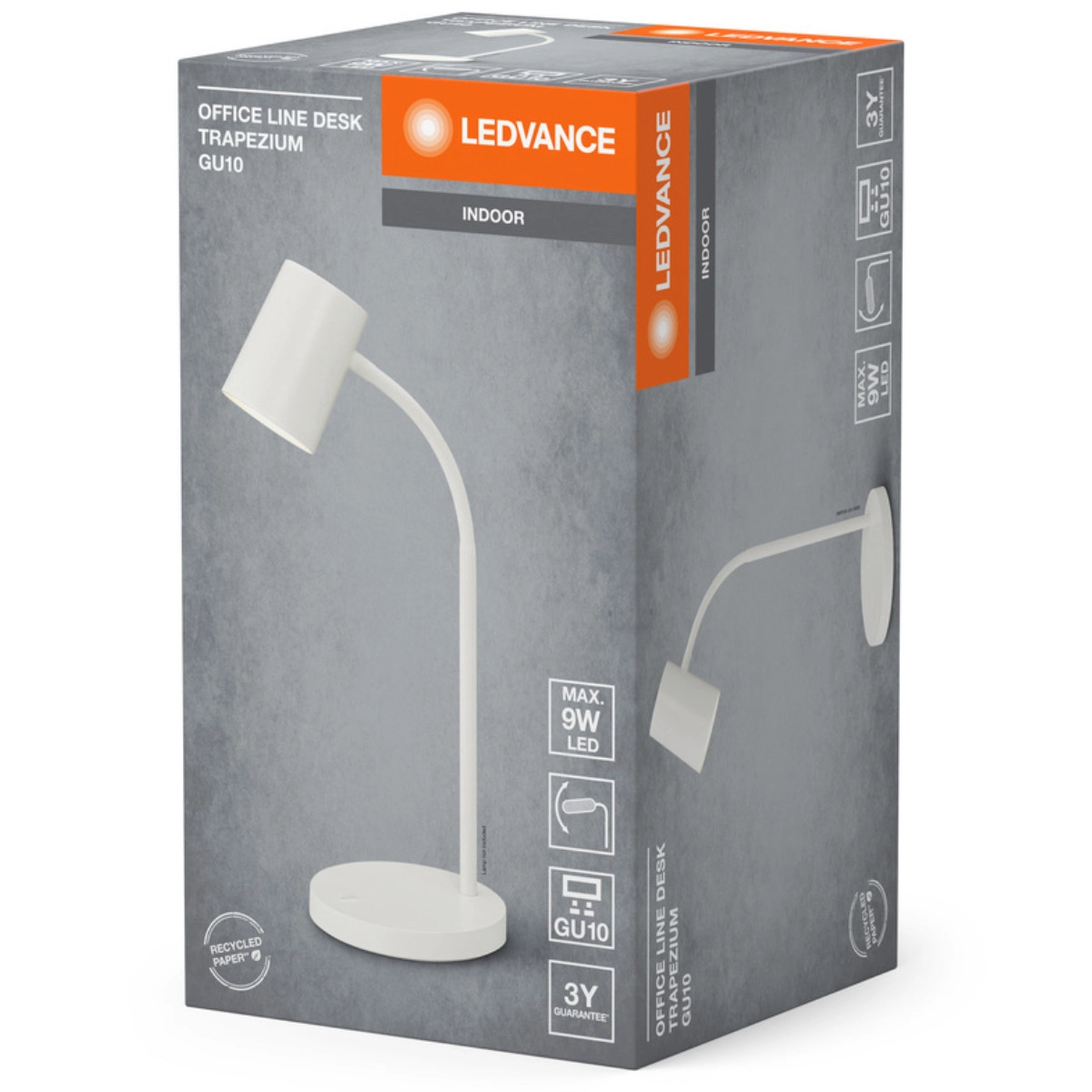 A Ledvance Office Line Desk Trapezium GU10 White asztali lámpa a modern munkaterek elegáns kiegészítője, amely tökéletes megvilágítást biztosít otthoni irodákban, íróasztalokon vagy élettereink bármely pontján. A klasszikus formavilágú, fehér színű lámpatest rugalmasan alakítható a mindennapi igényeknek megfelelően, így ideális választás mind munka-, mind általános megvilágítási célokra.