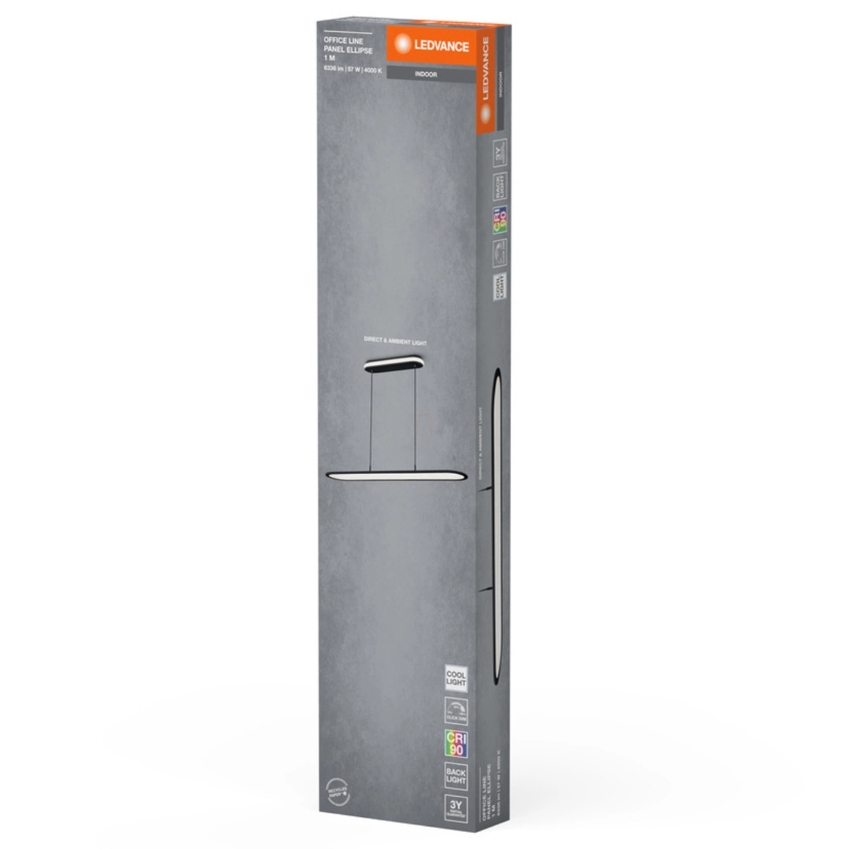 Az Office Line Panel Ellipse különleges tulajdonsága, hogy a munkafelület célzott megvilágítása mellett a lámpa alapjánál környezeti fényt is biztosít, ezzel kellemes, kiegyensúlyozott fényviszonyokat teremtve. A Click-DIM funkciónak köszönhetően a lámpa ismételt kapcsolással három lépésben dimmelhetővé válik, így a felhasználó könnyen beállíthatja a kívánt fényerősséget. A 102 fokos sugárzási szög széles területet képes lefedni, optimális fényeloszlást biztosítva a munkaterületen. A villódzási metrika (Pst LM) <1% és a stroboszkóp hatás metrika (SVM) <0,4 értékei garantálják a vibrálásmentes, szemkímélő világítást.