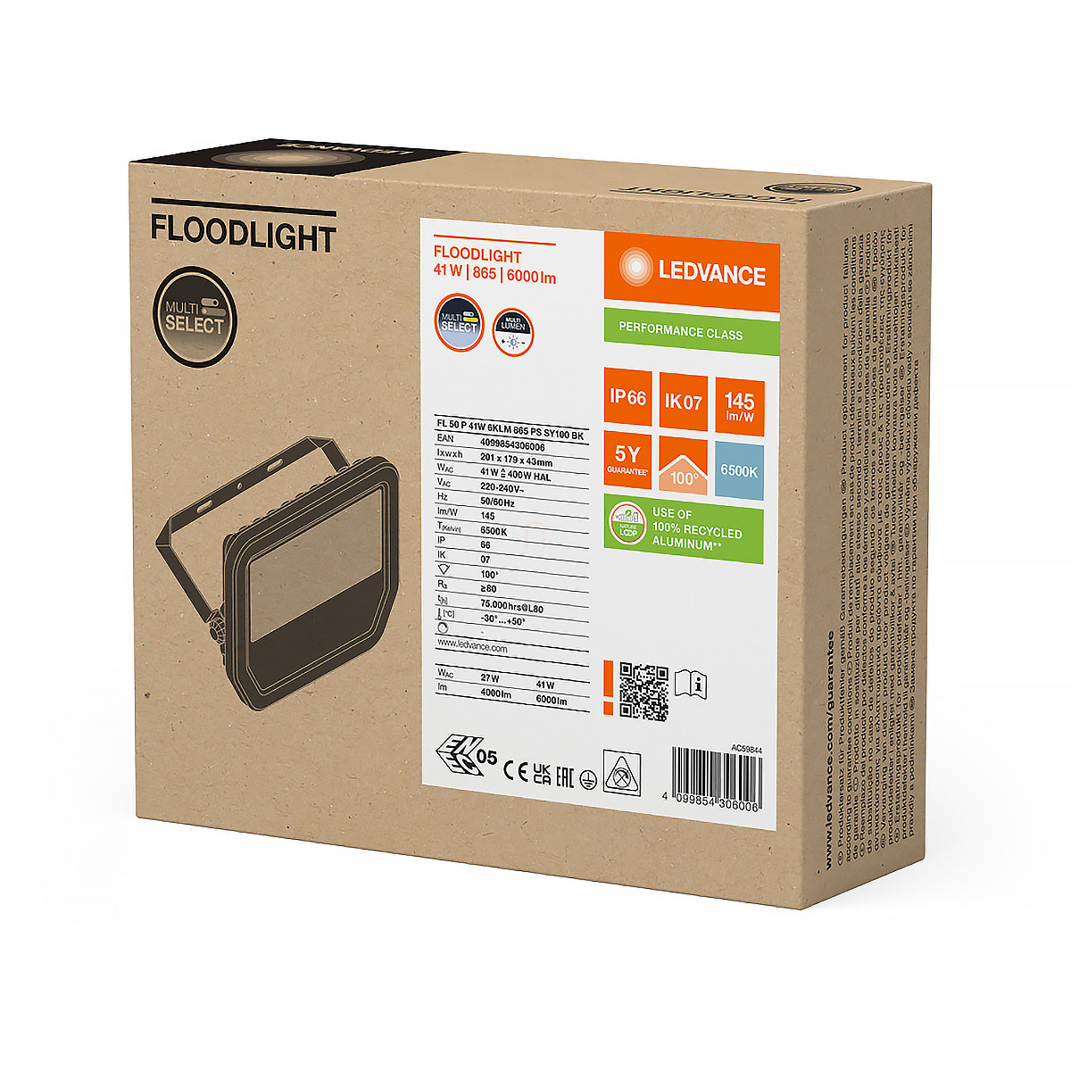 Ledvance professzionális Floodlight 50 szabályozható LED reflektor, 6000 lm/4000 lm, 6500 K, 41W, RA80, 100 °x 100 °, IP66, 201mm
