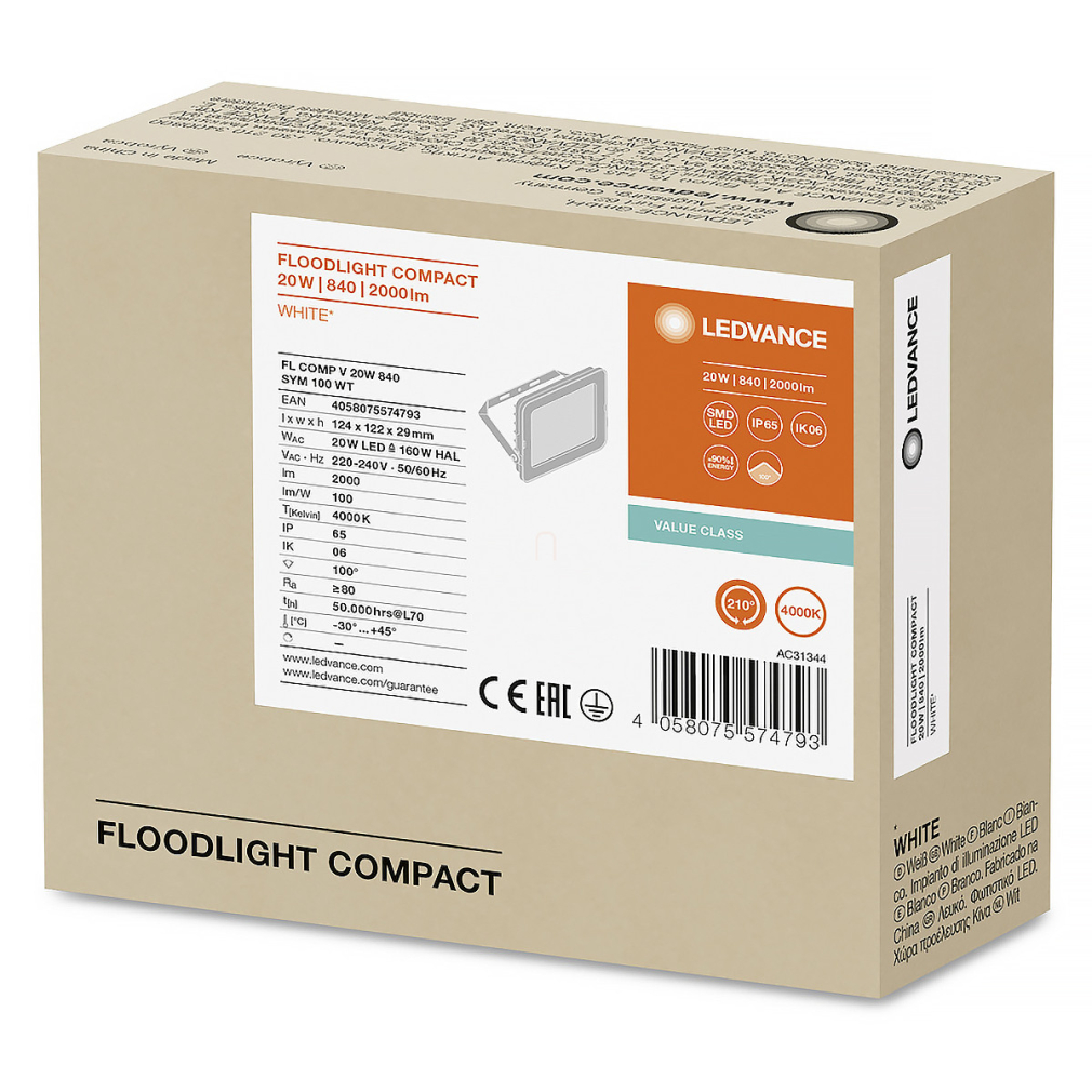 Ledvance professzionális Floodlight Compact 20W szabályozható LED reflektor, 2000 lm, 4000 K, 20W, RA≥80, 100 °x 100 °, IP65 124mm