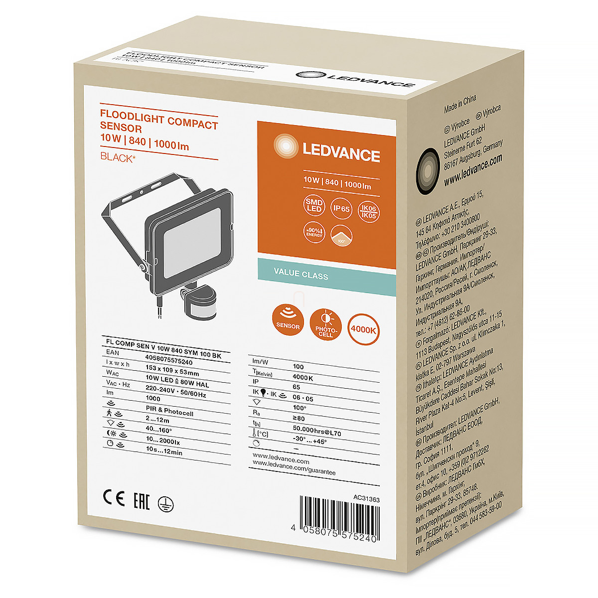 Ledvance professzionális Floodlight Compact Sensor 10W LED reflektor, 1000 lm, 4000 K, 10W, RA≥80, 100 °x 100 °, IP65 153mm